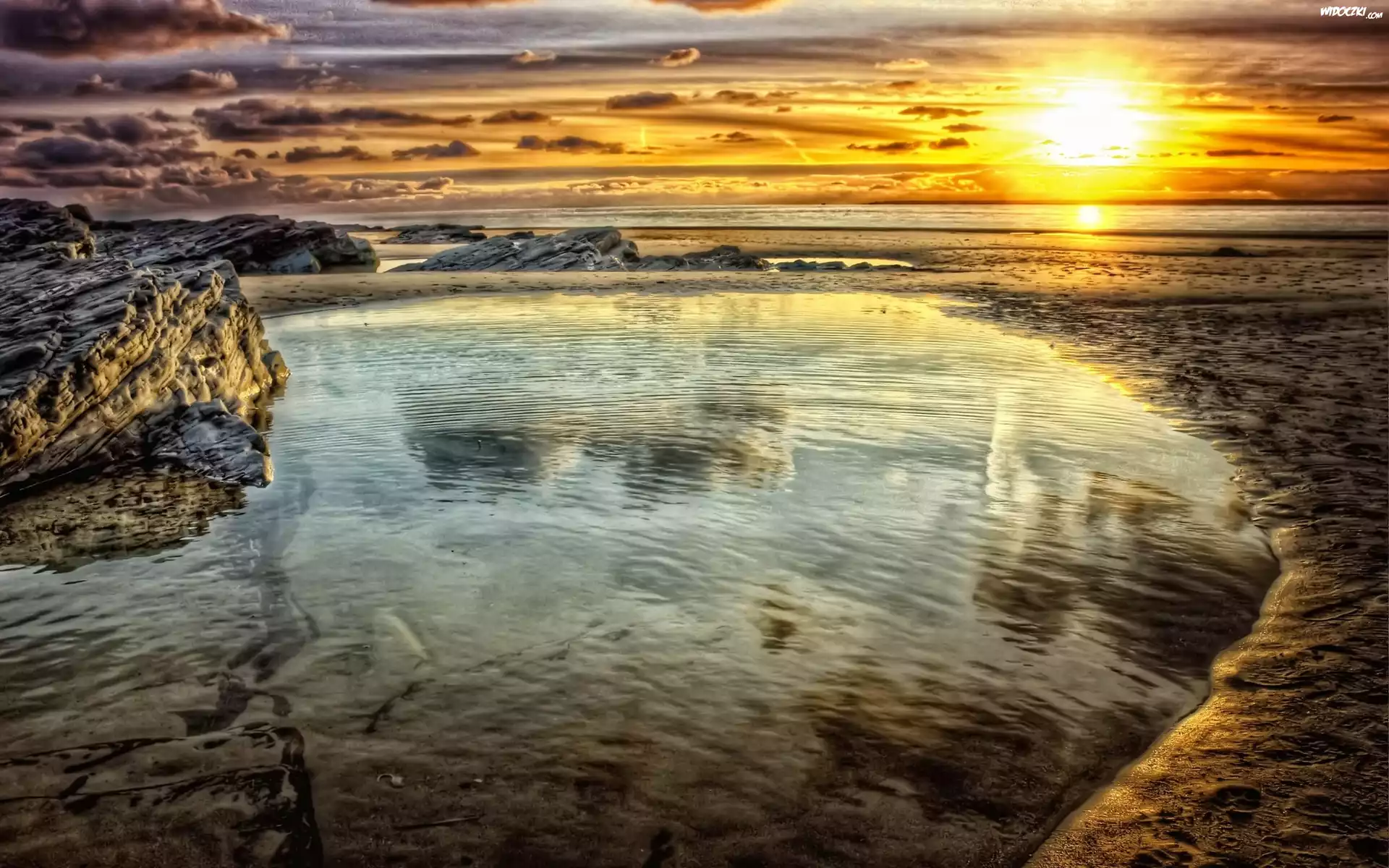 Zachód, Słońca, Jezioro, Chmury, Skały