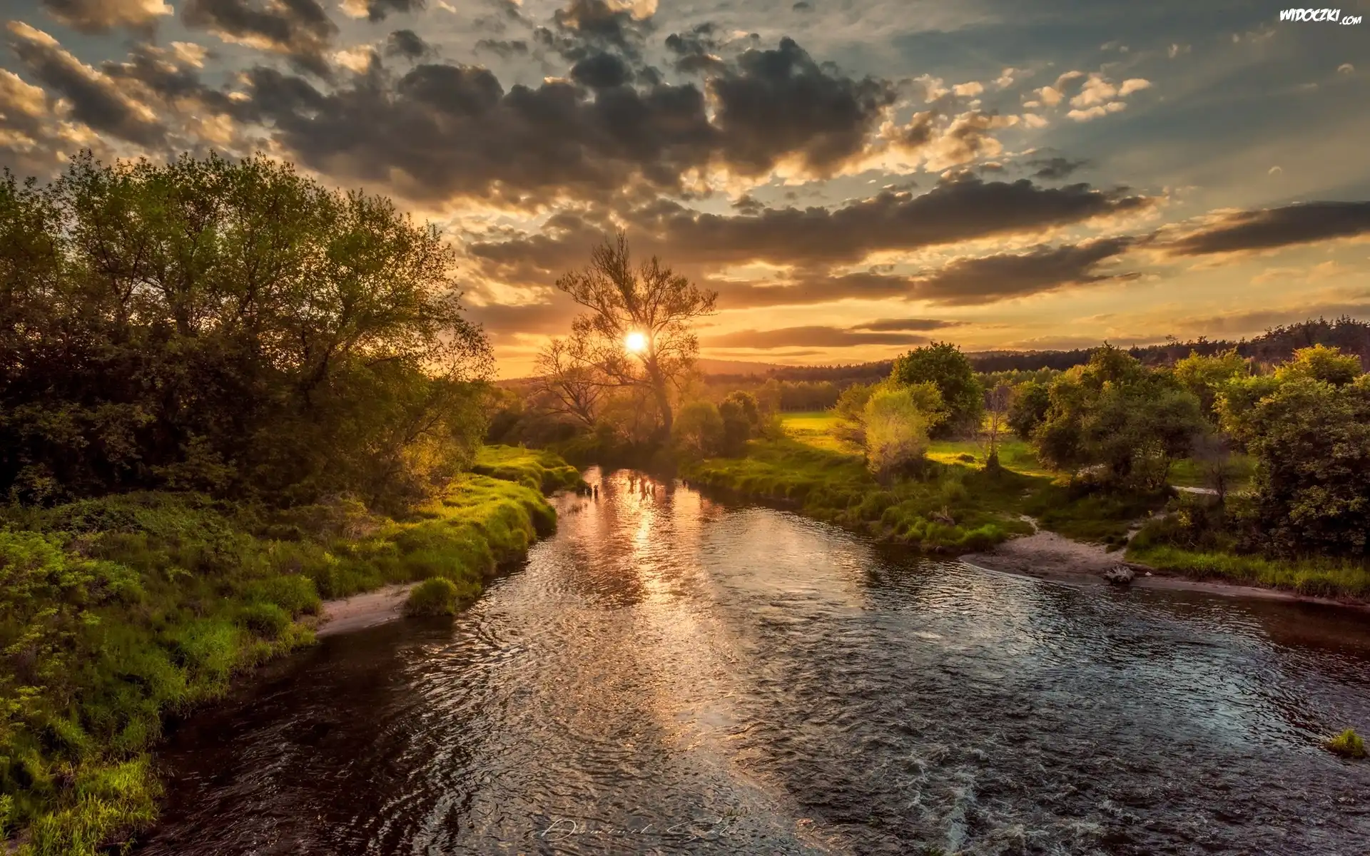 Rzeka, Drzewa, Krzewy, Zachód słońca, Chmury