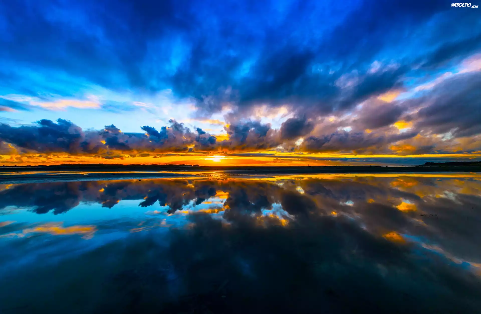 Zdjęcia, Zachód słońca, Morze, Chmury, Odbicie