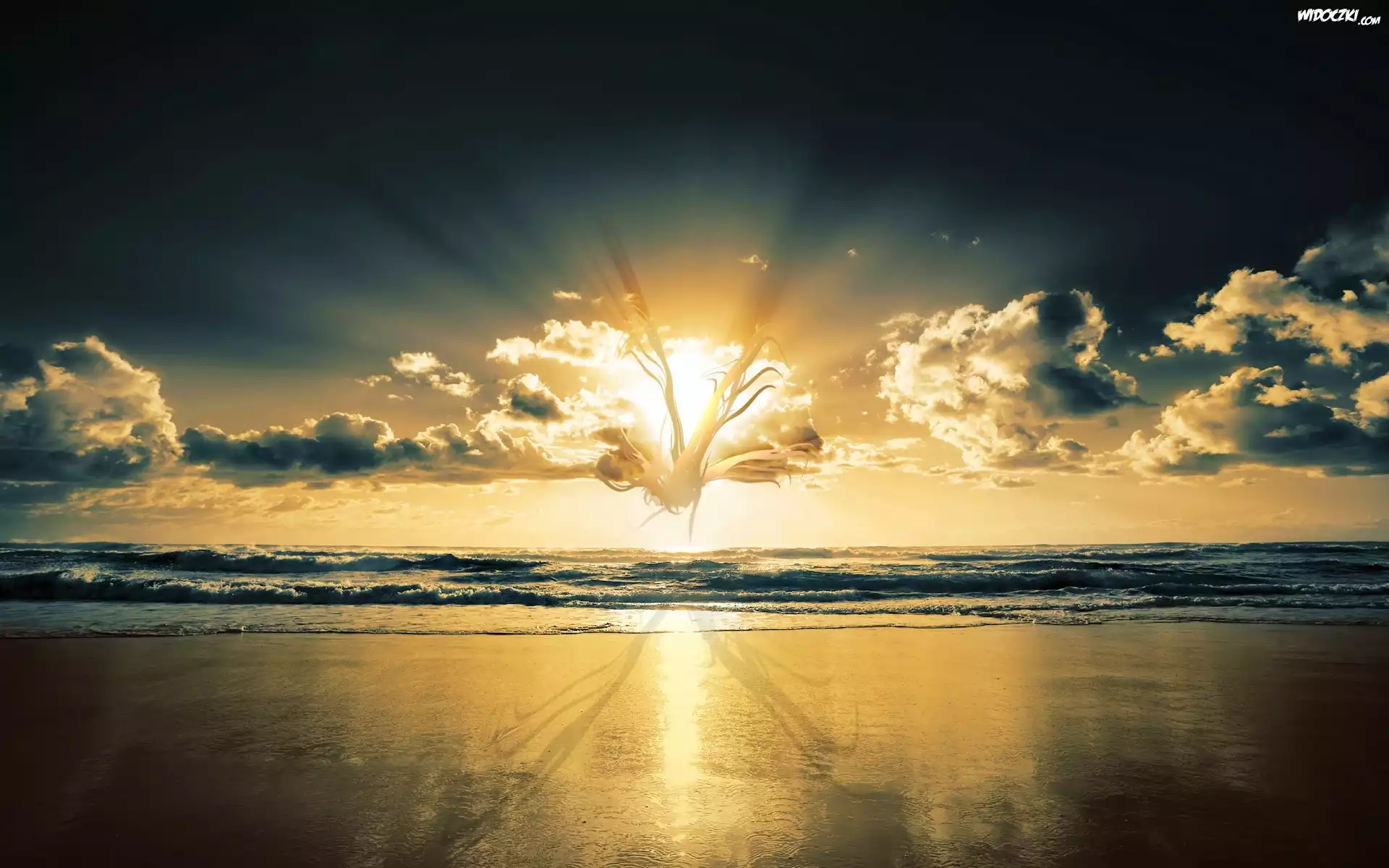 Zdjęcia, Zachód, Słońca, Morze, Chmury, Piórko