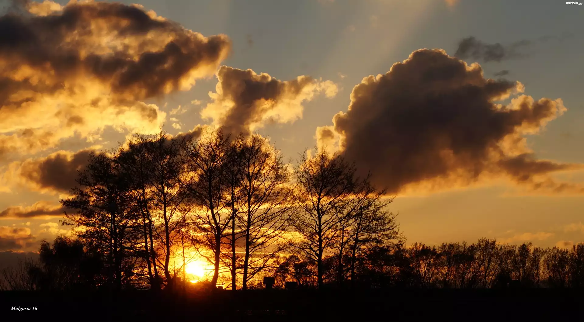 Zachód słońca, Niebo, Chmury, Drzewa