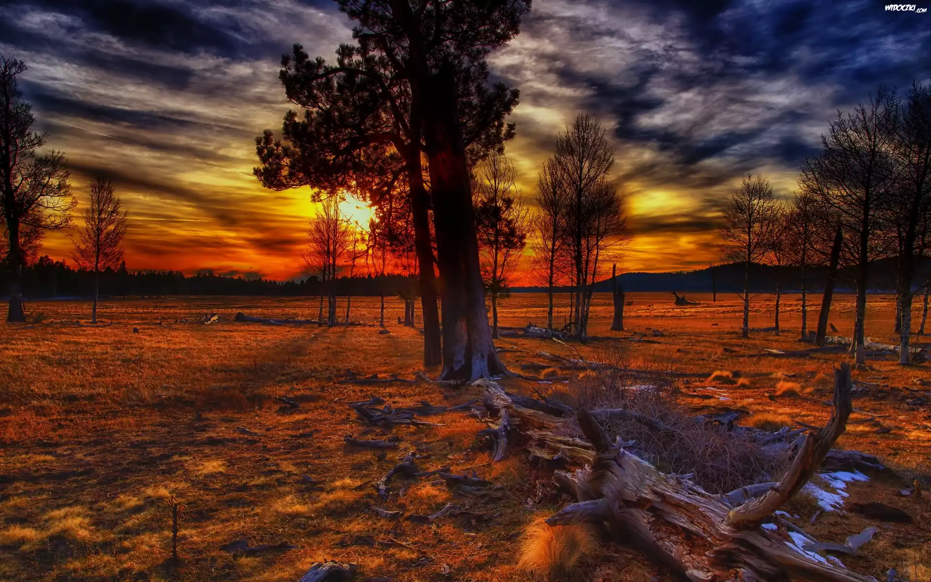 Zdjęcia, Zachod, Slonca, Niebo, Chmury, Drzewa
