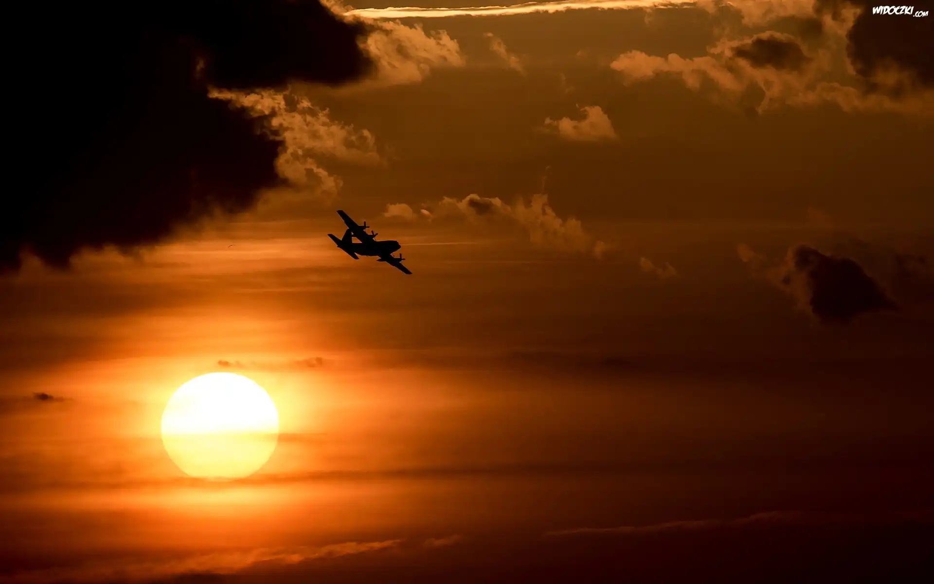 Zdjęcia, Zachód Słońca, Niebo, Chmury, Samolot