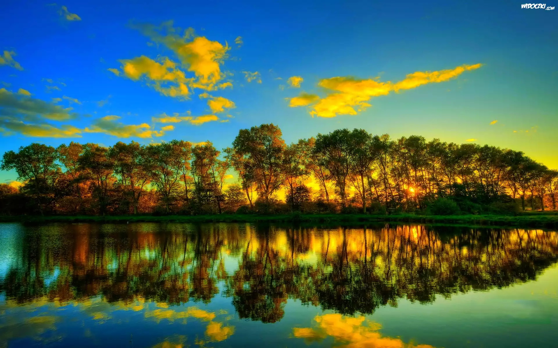 Zdjęcia, Zachód, Słońca, Rzeka, Drzewa, Chmury, Odbicie