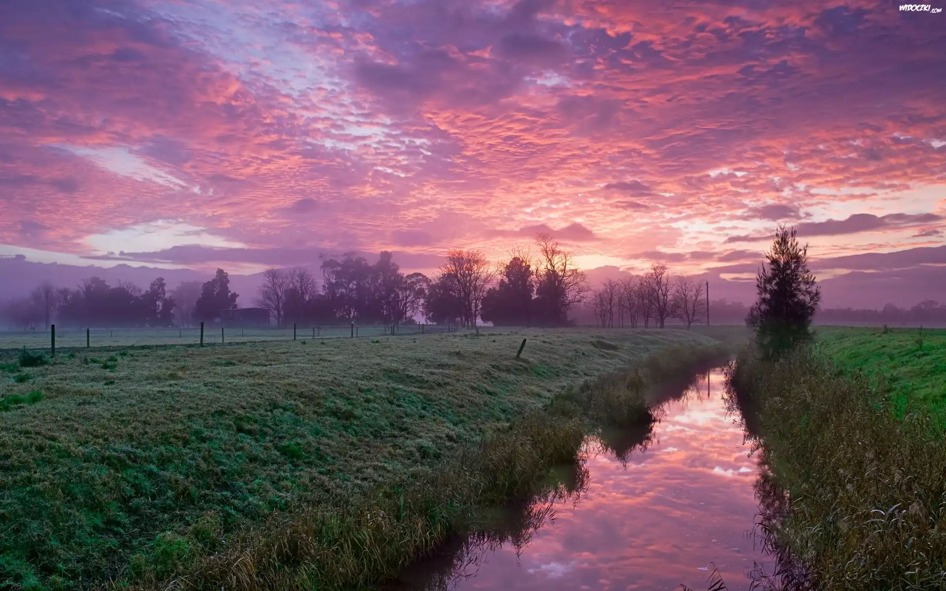 Zdjęcia, Zachód, Słońca, Chmury, Łąka