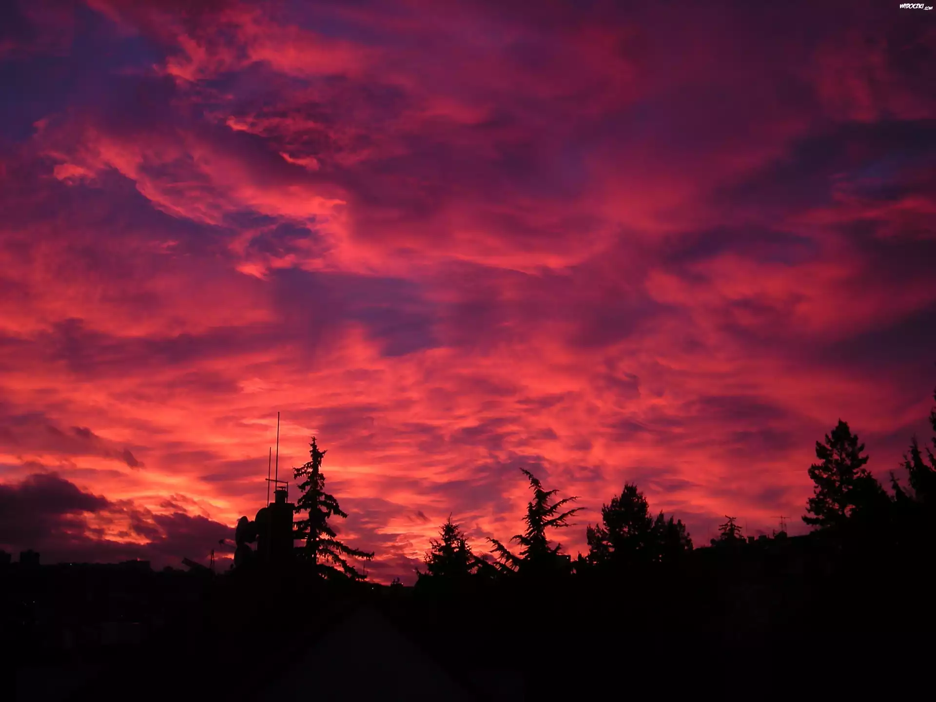 Zdjęcia, Zachód, Słońca, Chmury, Drzewa