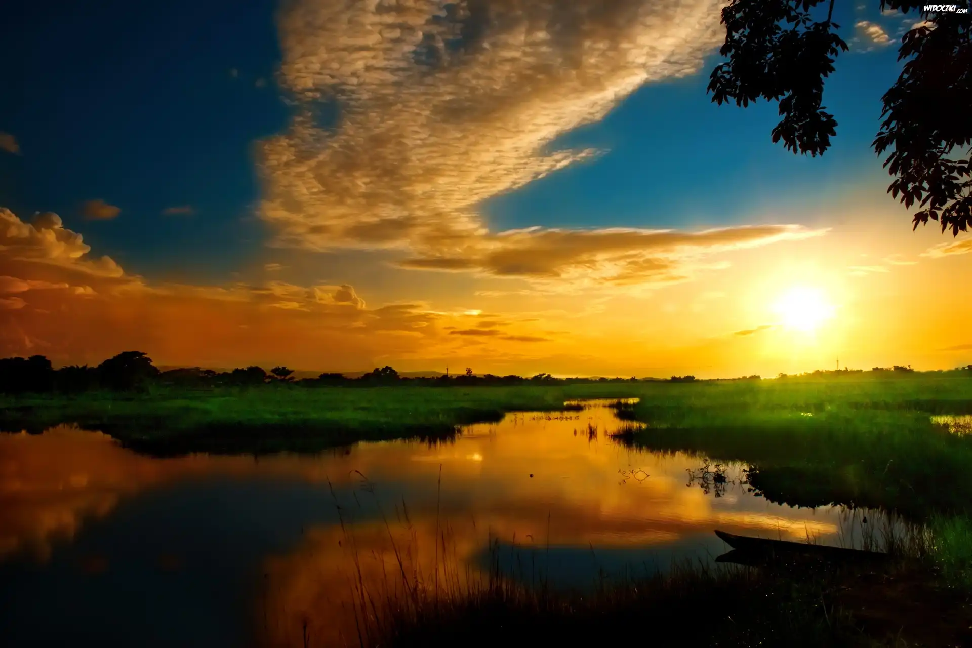 Zdjęcia, Zachód, Słońca, Chmury, Jezioro