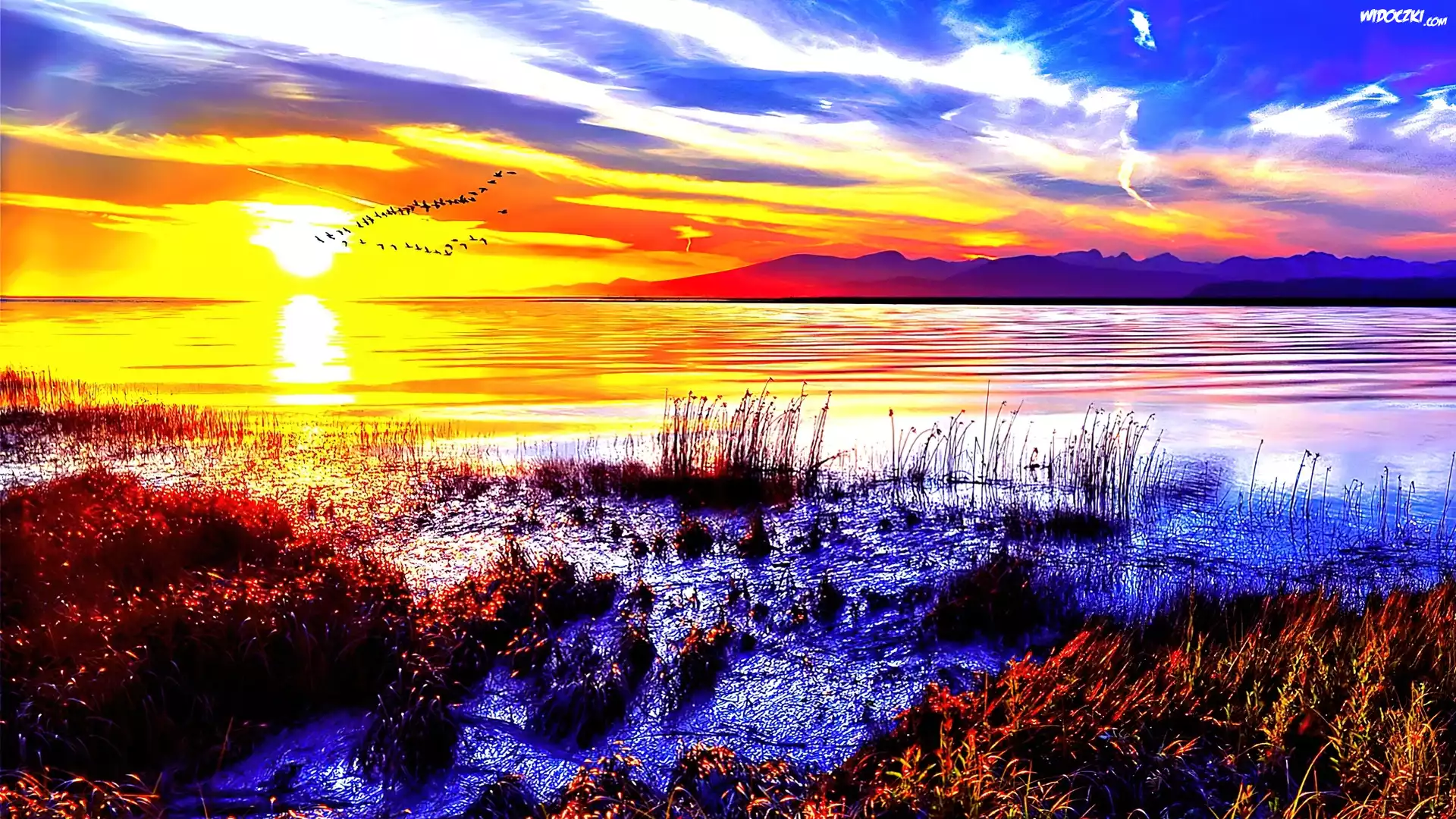 Zdjęcia, Zachód, Słońca, Chmury, Jezioro