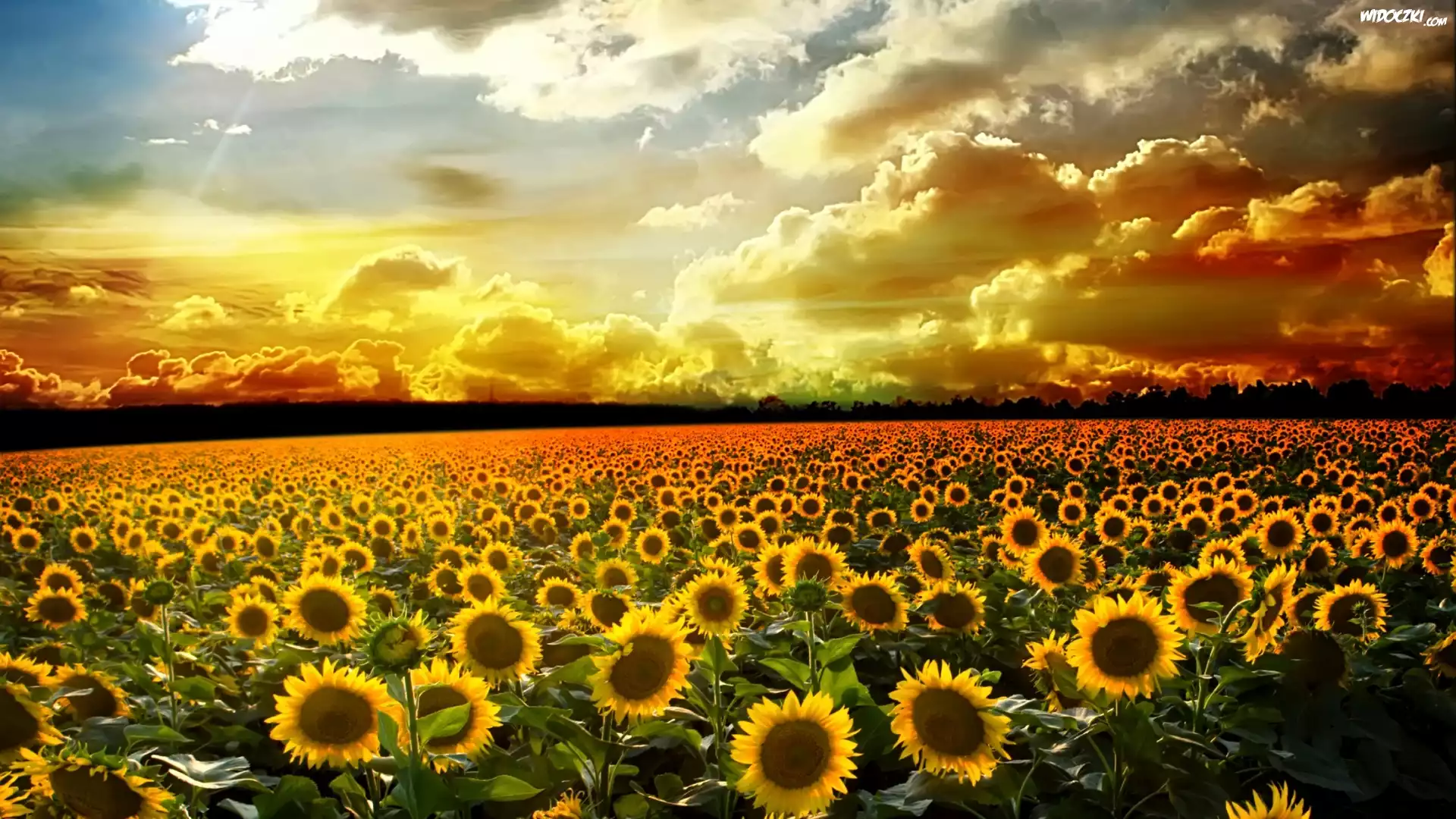 Zdjęcia, Zachód, Słońca, Chmury, Słoneczniki