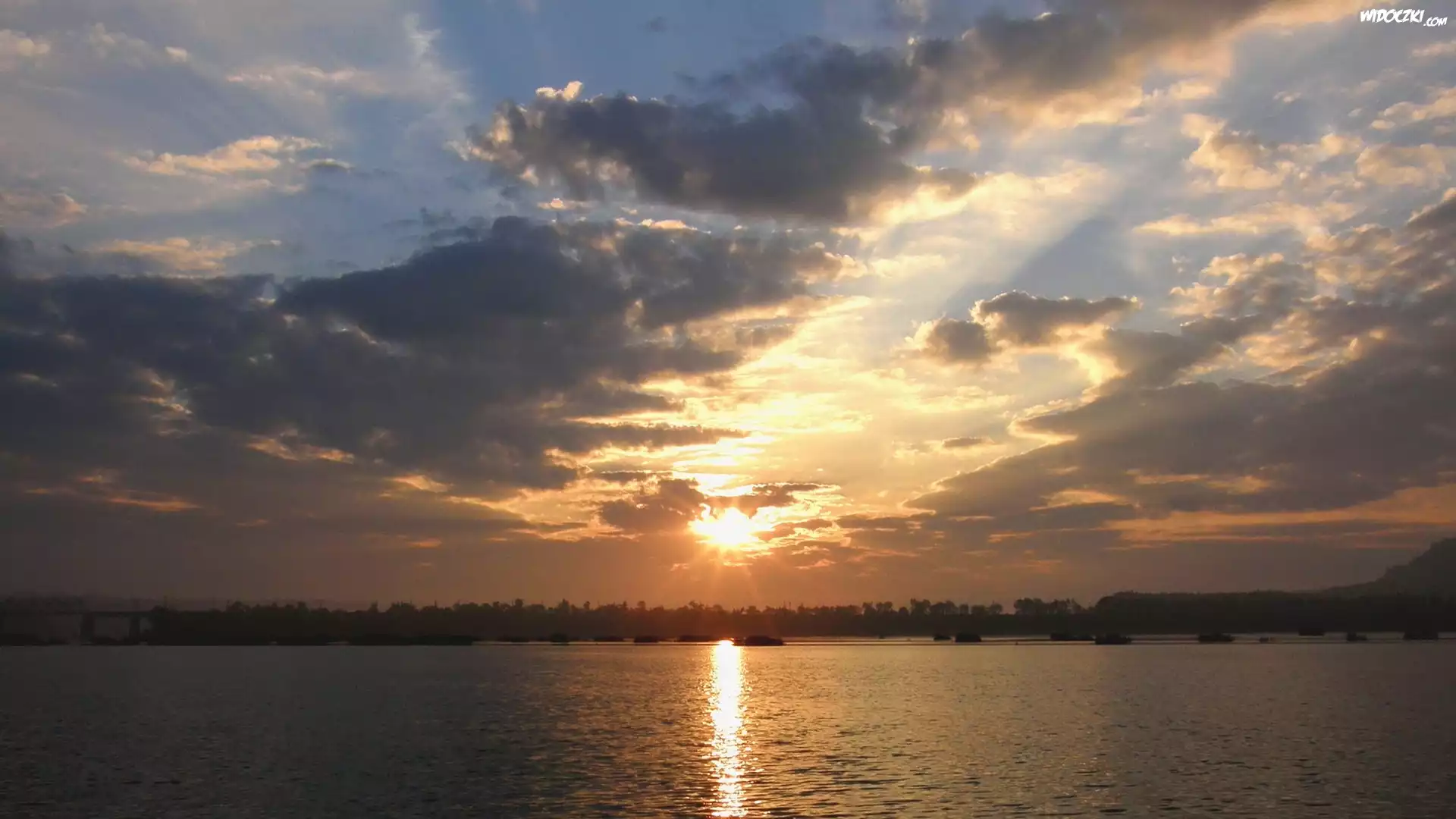 Zdjęcia, Zachód, Słońca, Jezioro, Ciemne, Chmury