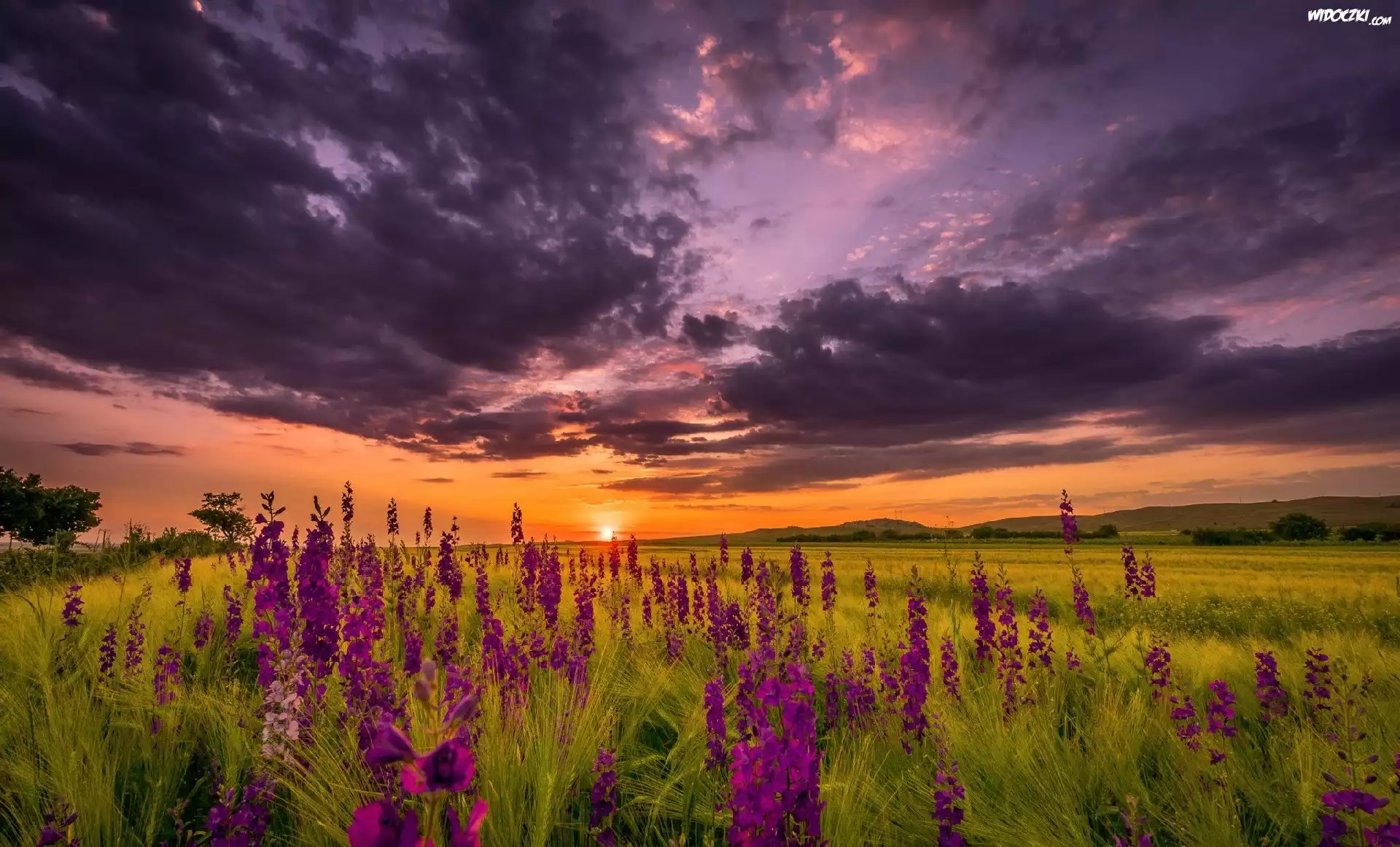 Zdjęcia, Zachód słońca, Kwiaty, Łąka, Ciemne, Chmury