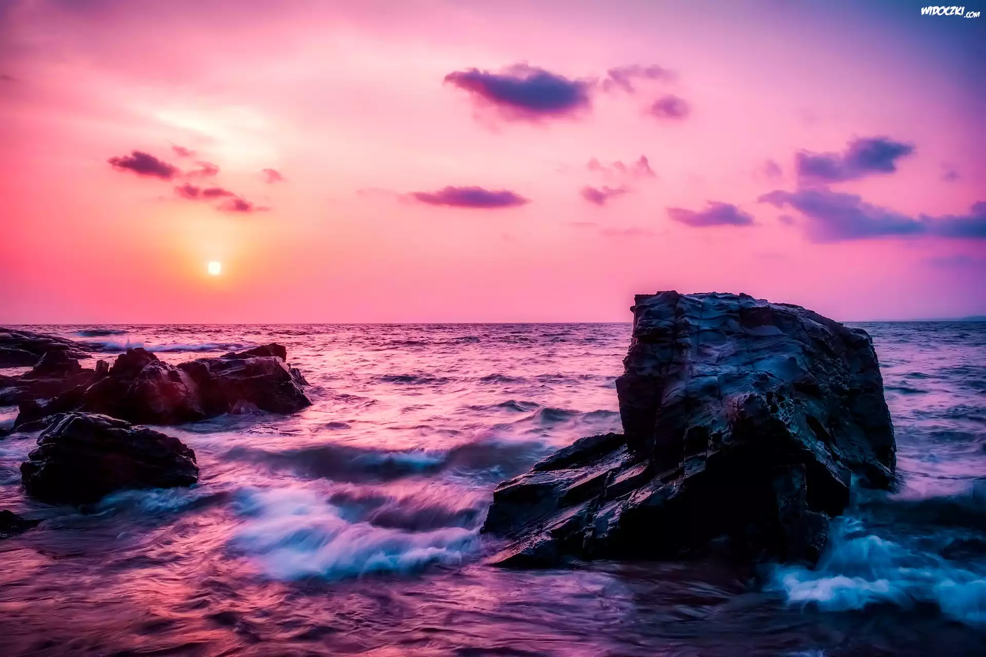Zachód słońca, Morze, Skały, Czerwone, Niebo