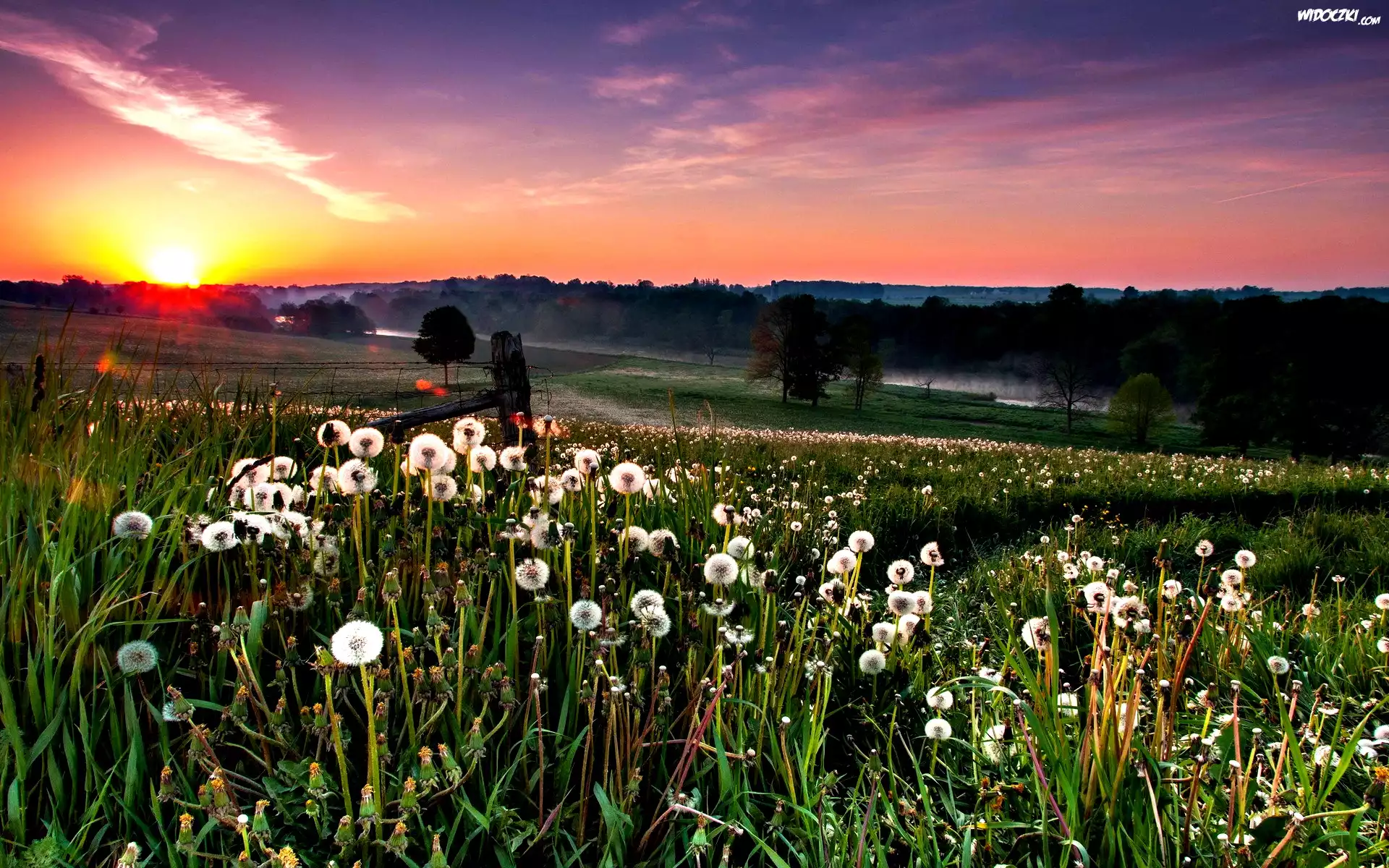 Zdjęcia, Zachód, Słońca, Dmuchawce, Trawa