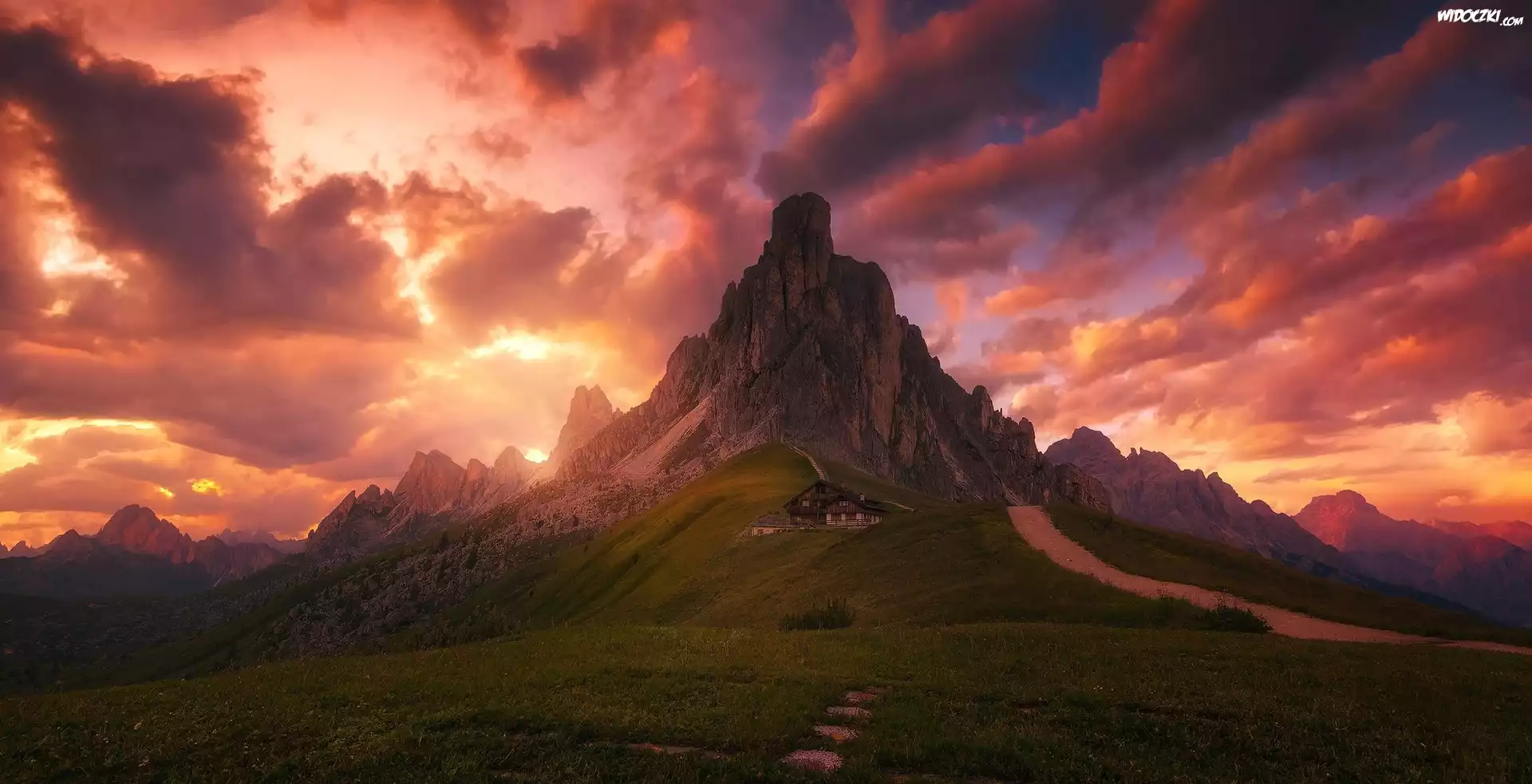 Zdjęcia, Zachód słońca, Góry, Dom, Droga