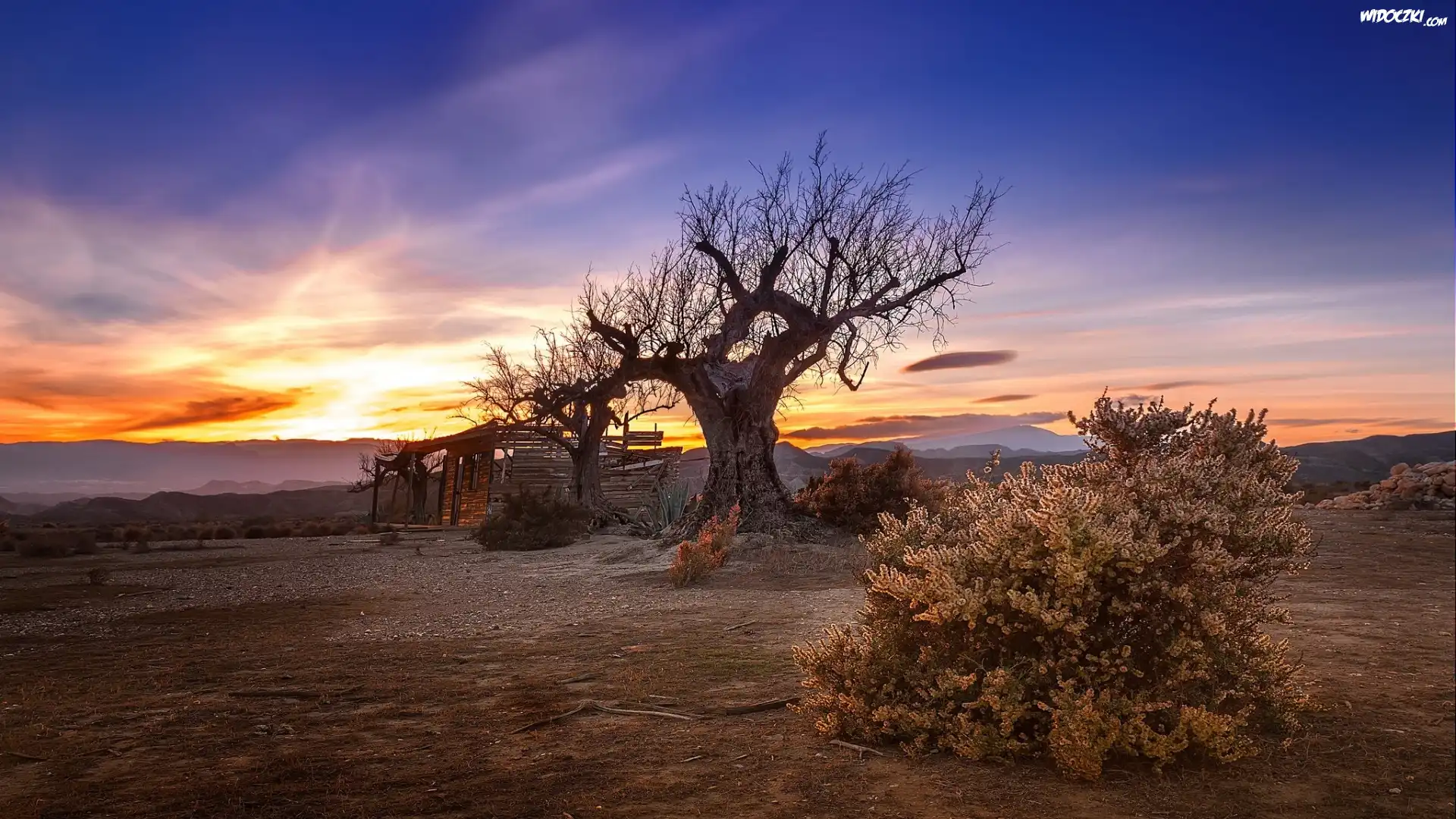 Zachód słońca, Zniszczony, Dom, Drzewa
