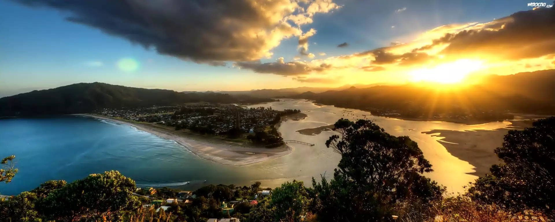 Zdjęcia, Zachód, Słońca, Jeziora, Chmury, Domy, Drzewa