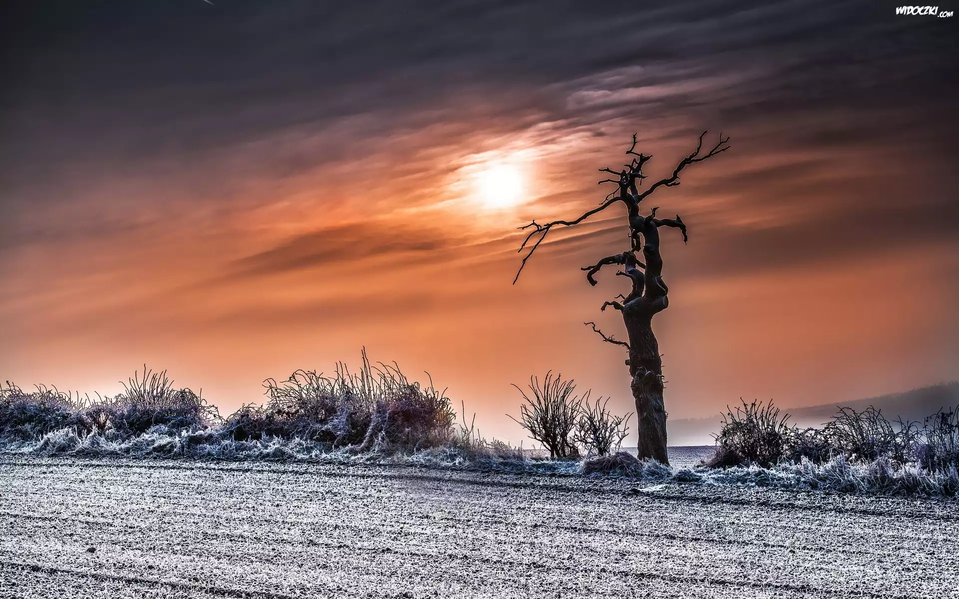 Zdjęcia, Zachód, Słońca, Drzewo, Droga, Zima