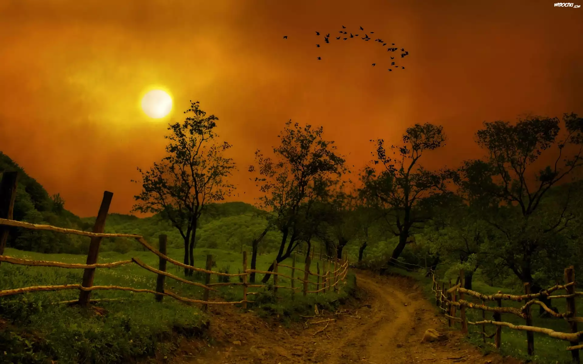 Zdjęcia, Zachód, Słońca, Góry, Drzewa, Droga, Ogrodzenie