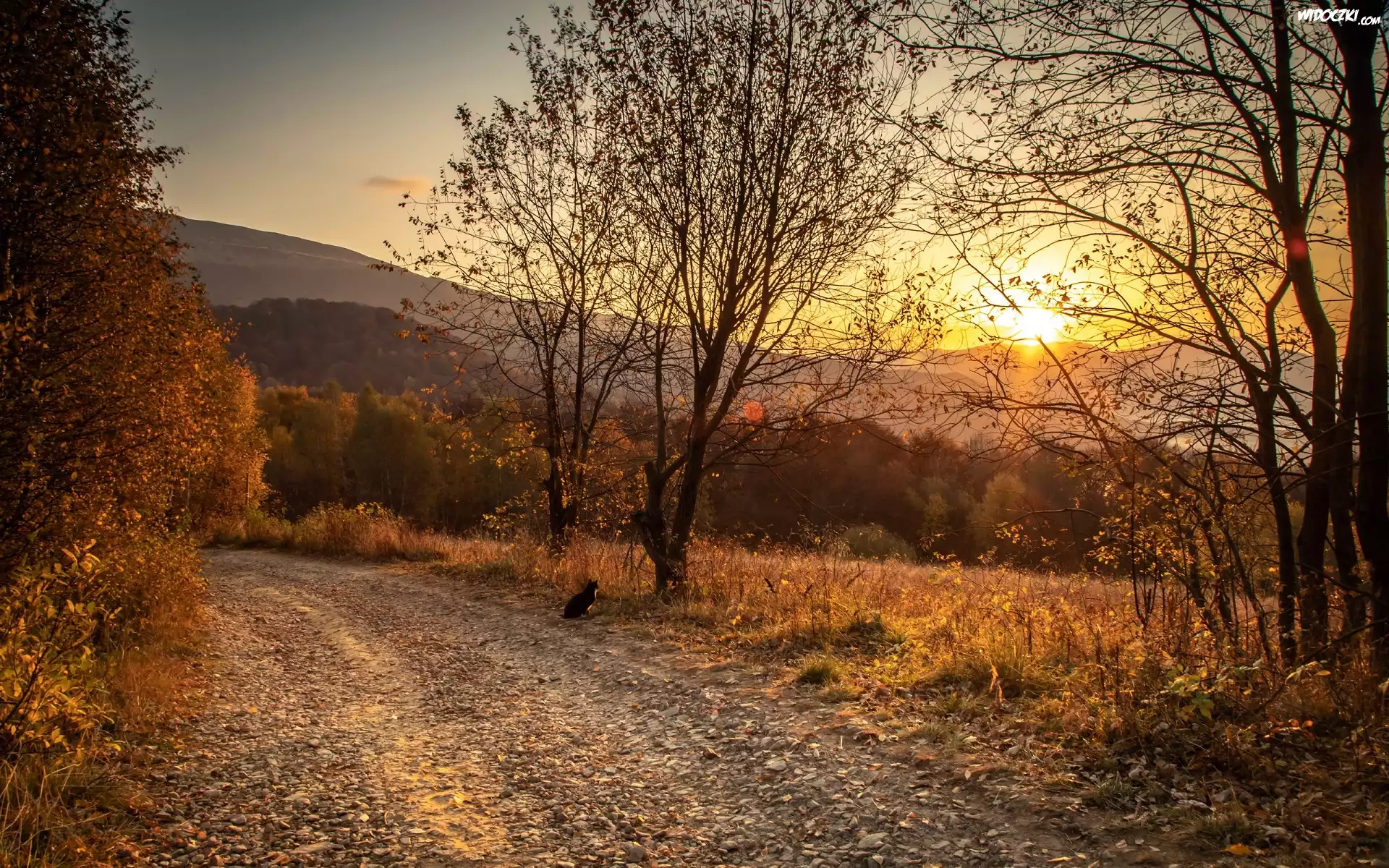 Zdjęcia, Zachód słońca, Jesień, Drzewa, Droga, Kot