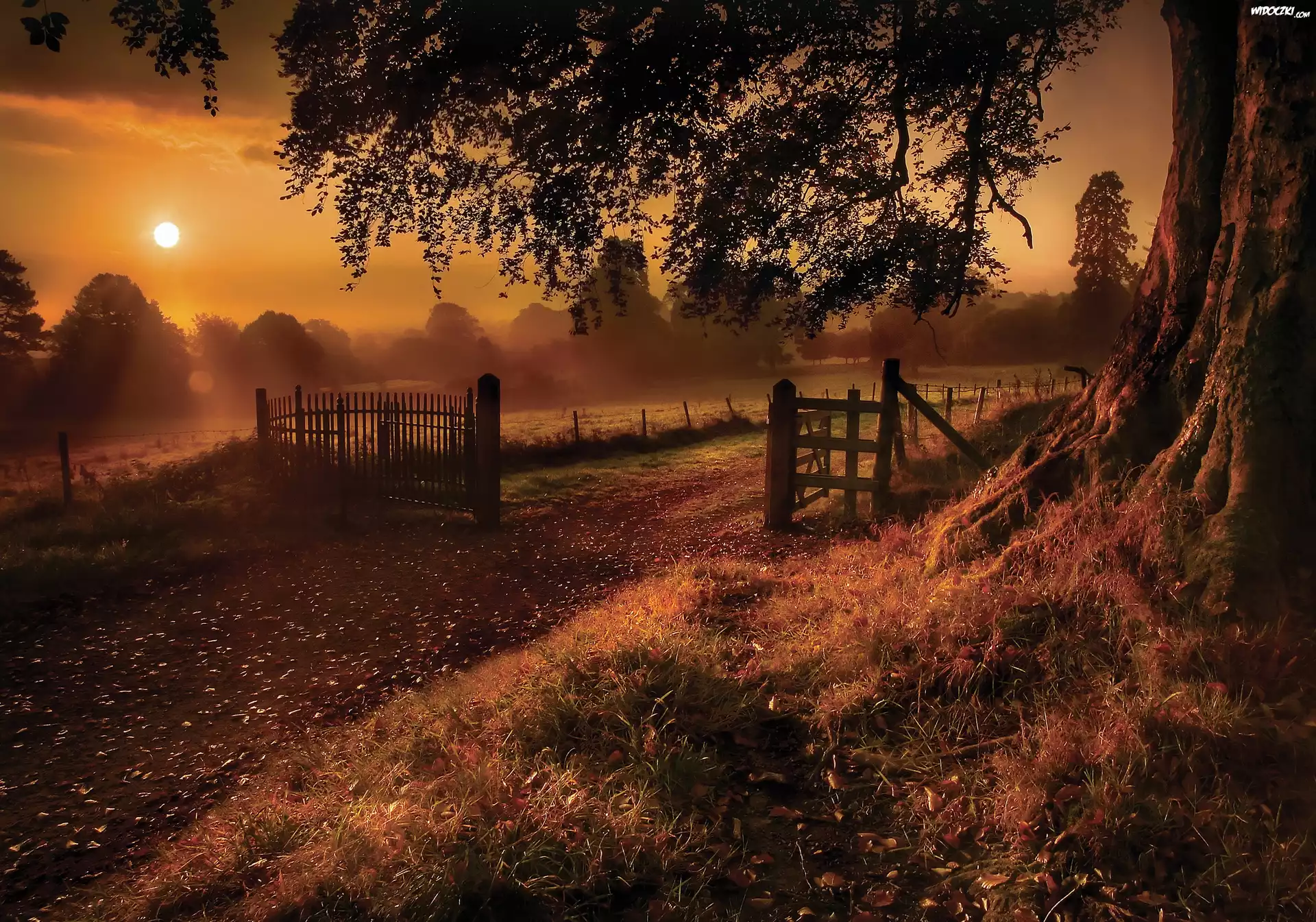 Zdjęcia, Zachód, Słońca, Wiejska, Droga, Brama