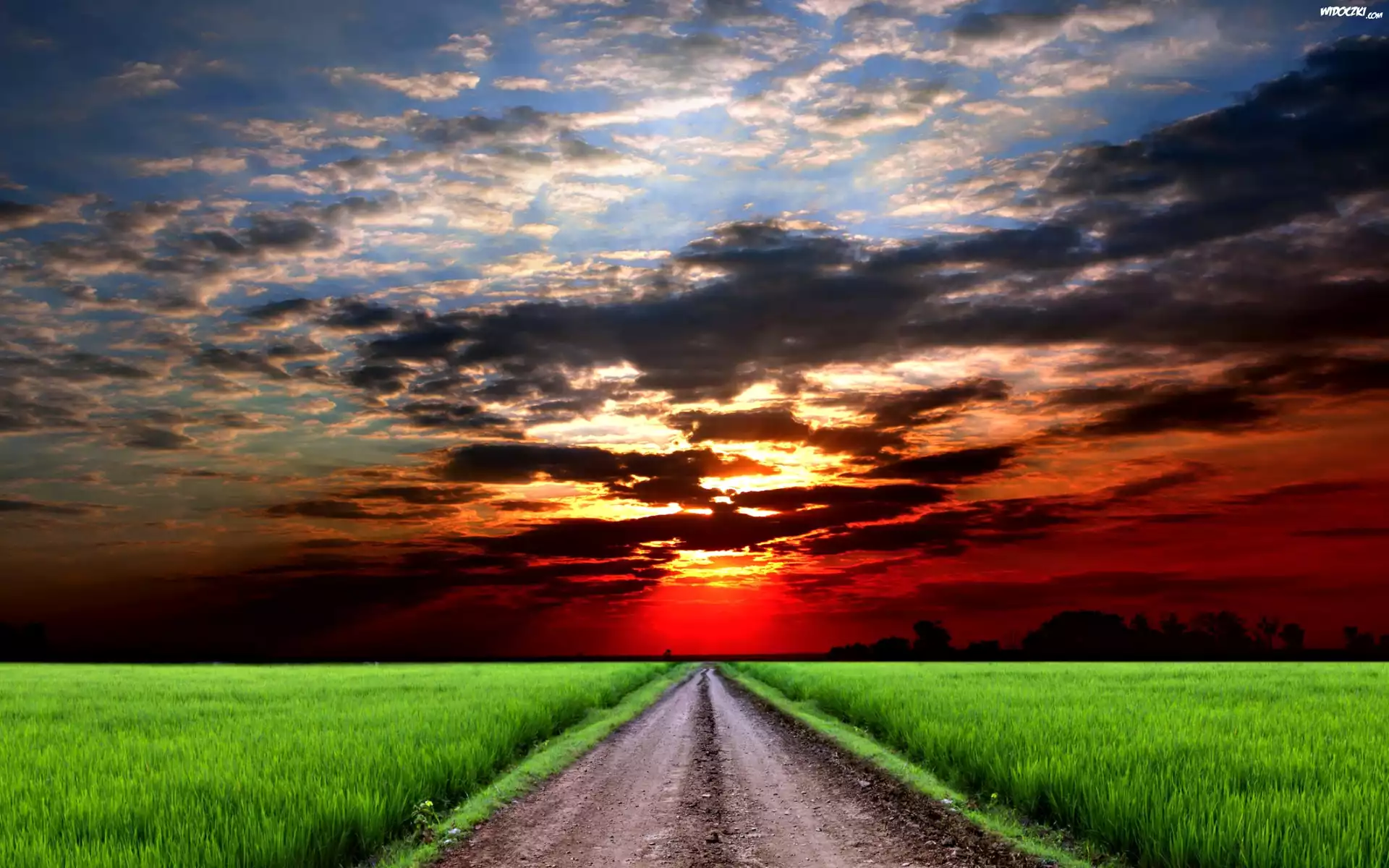 Zdjęcia, Zachód, Słońca, Wiejska, Droga, Pola