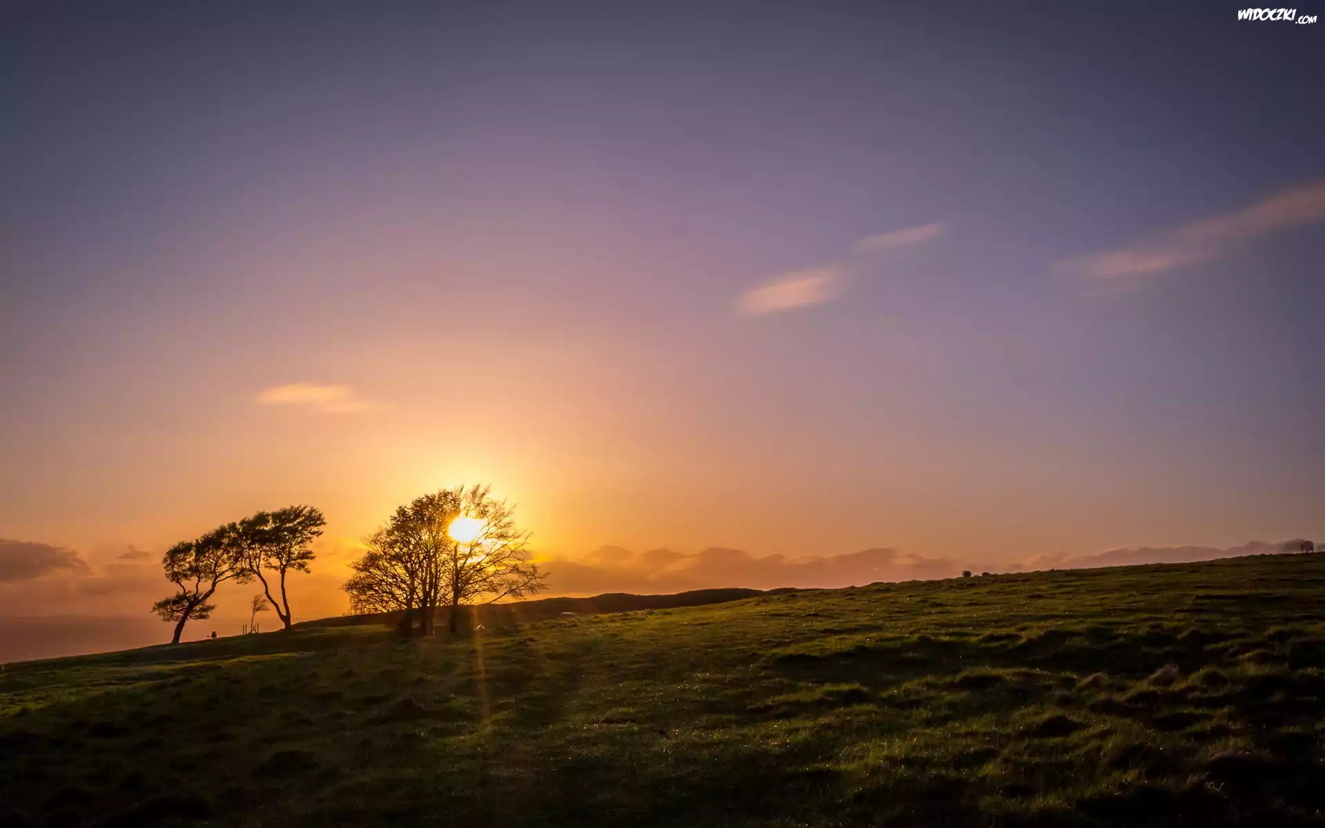 Zdjęcia, Łąka, Drzewa, Zachód Słońca