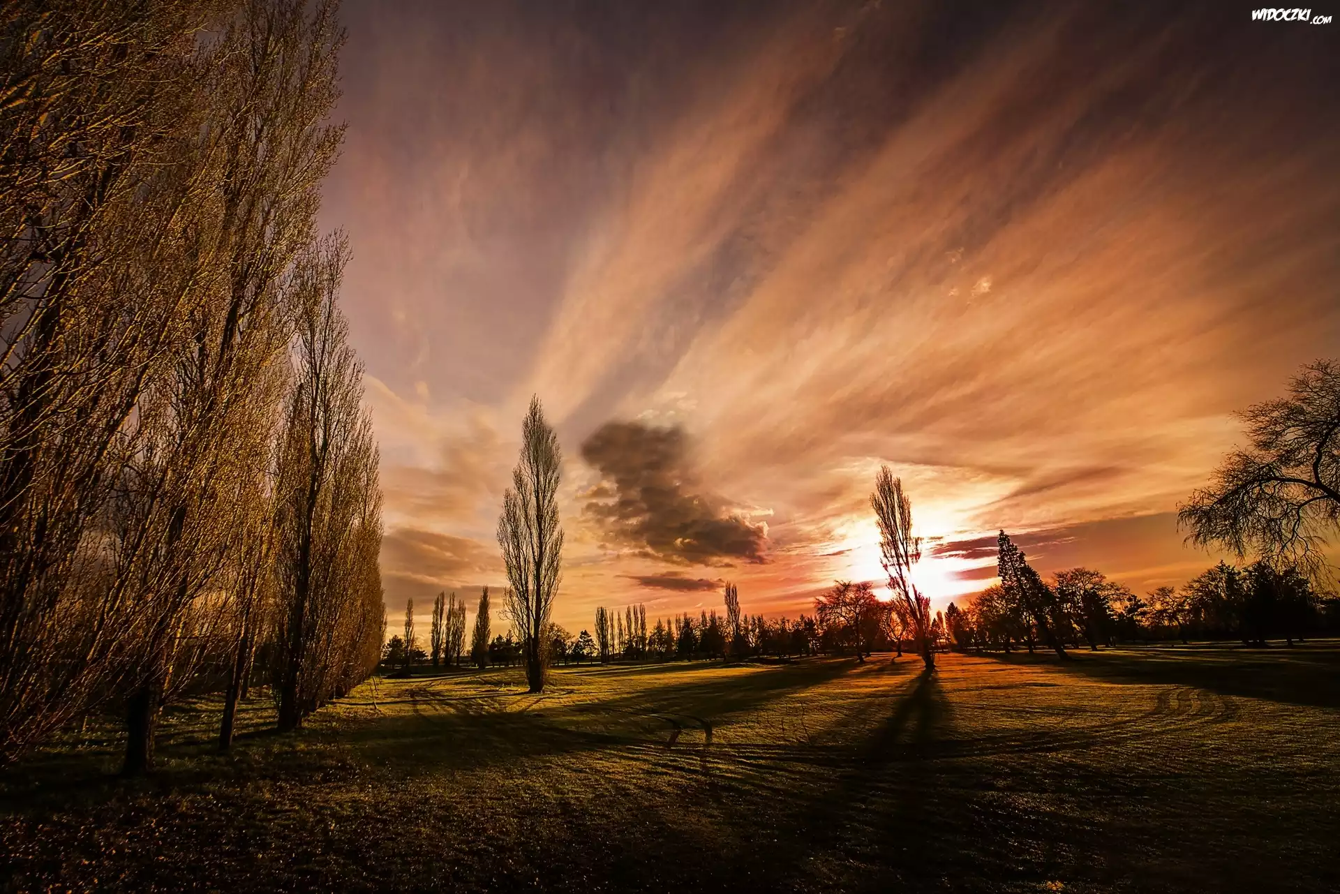 Zdjęcia, Zachód Słońca, Chmury, Drzewa, Łąka
