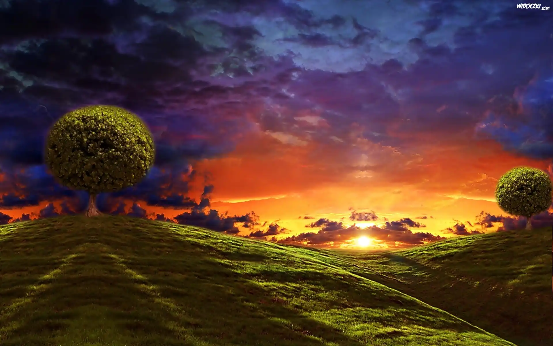 Zachód Słońca, Chmury, Drzewa, Wyżyny