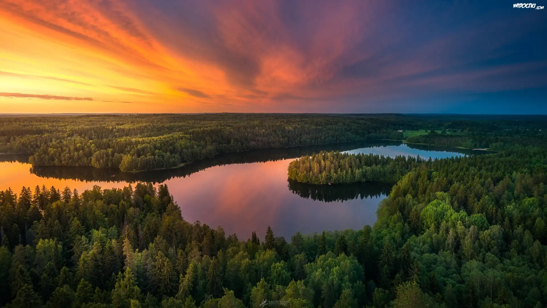 Finlandia, Zachód słońca, Jezioro Aulangonjärvi, Lasy, Drzewa