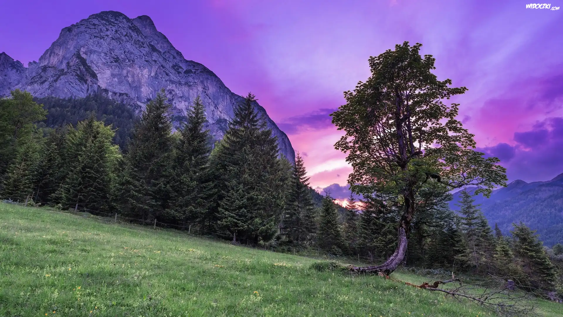 Zdjęcia, Zachód słońca, Góra, Drzewa, Łąka