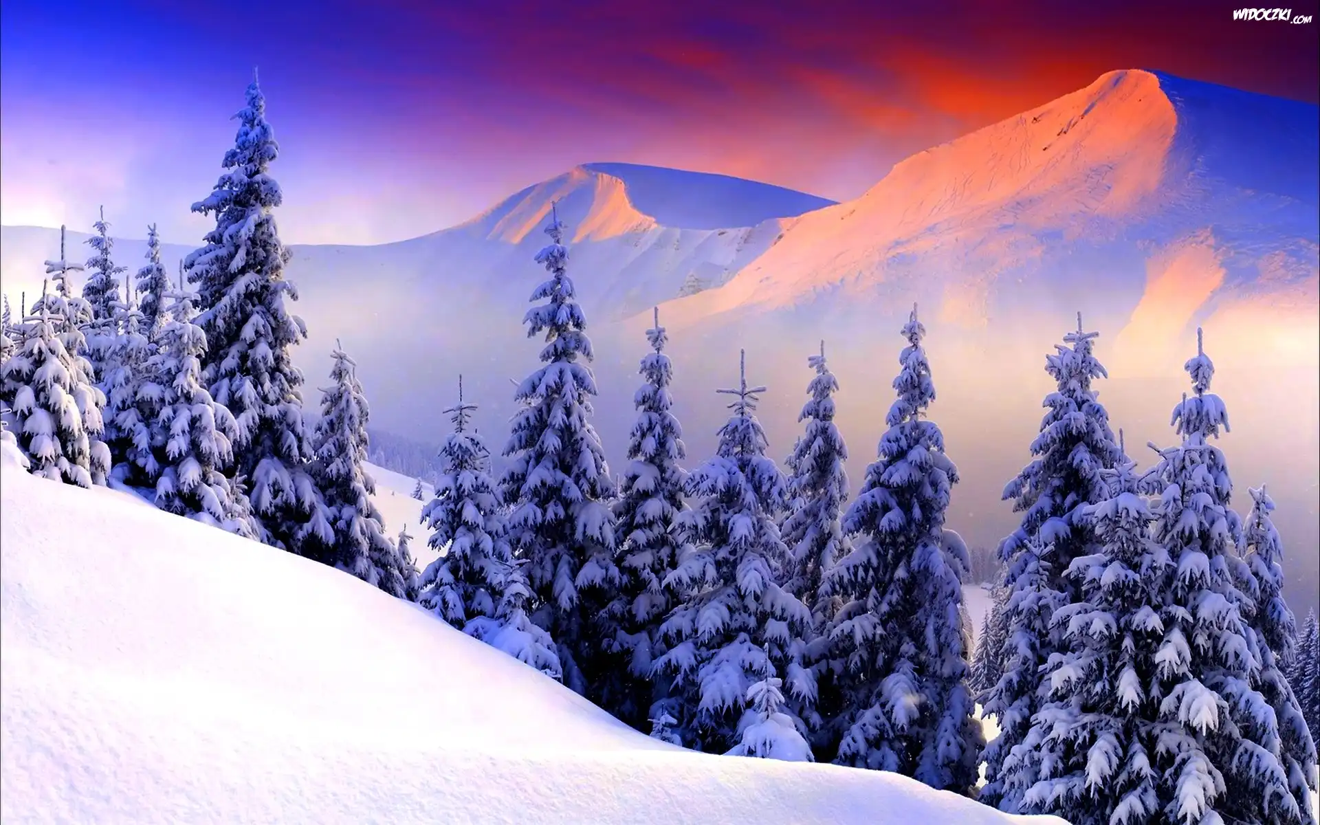 Zachód, Słońca, Góry, Drzewa, Zima