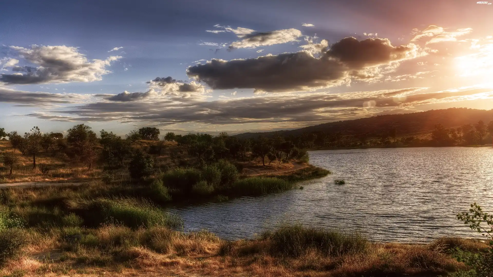Zachód, Słońca, Jezioro, Drzewa, Chmury
