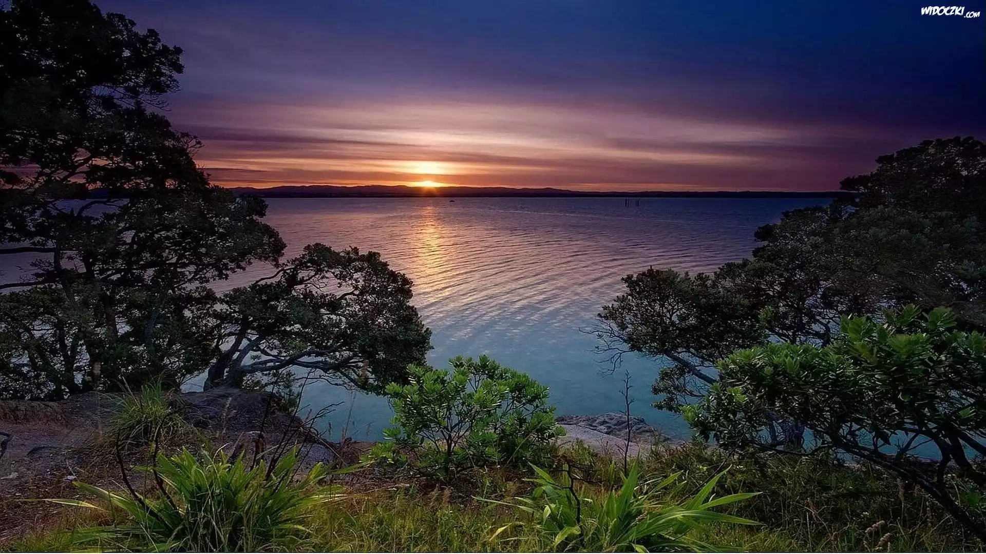 Zdjęcia, Zachód, Słońca, Jezioro, Drzewa, Trawy
