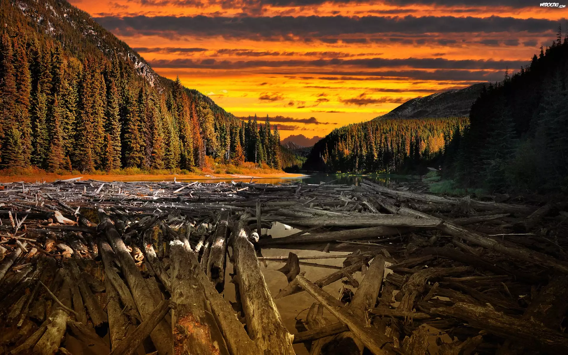 Zachód, Słońca, Lasy, Drzewa, Woda
