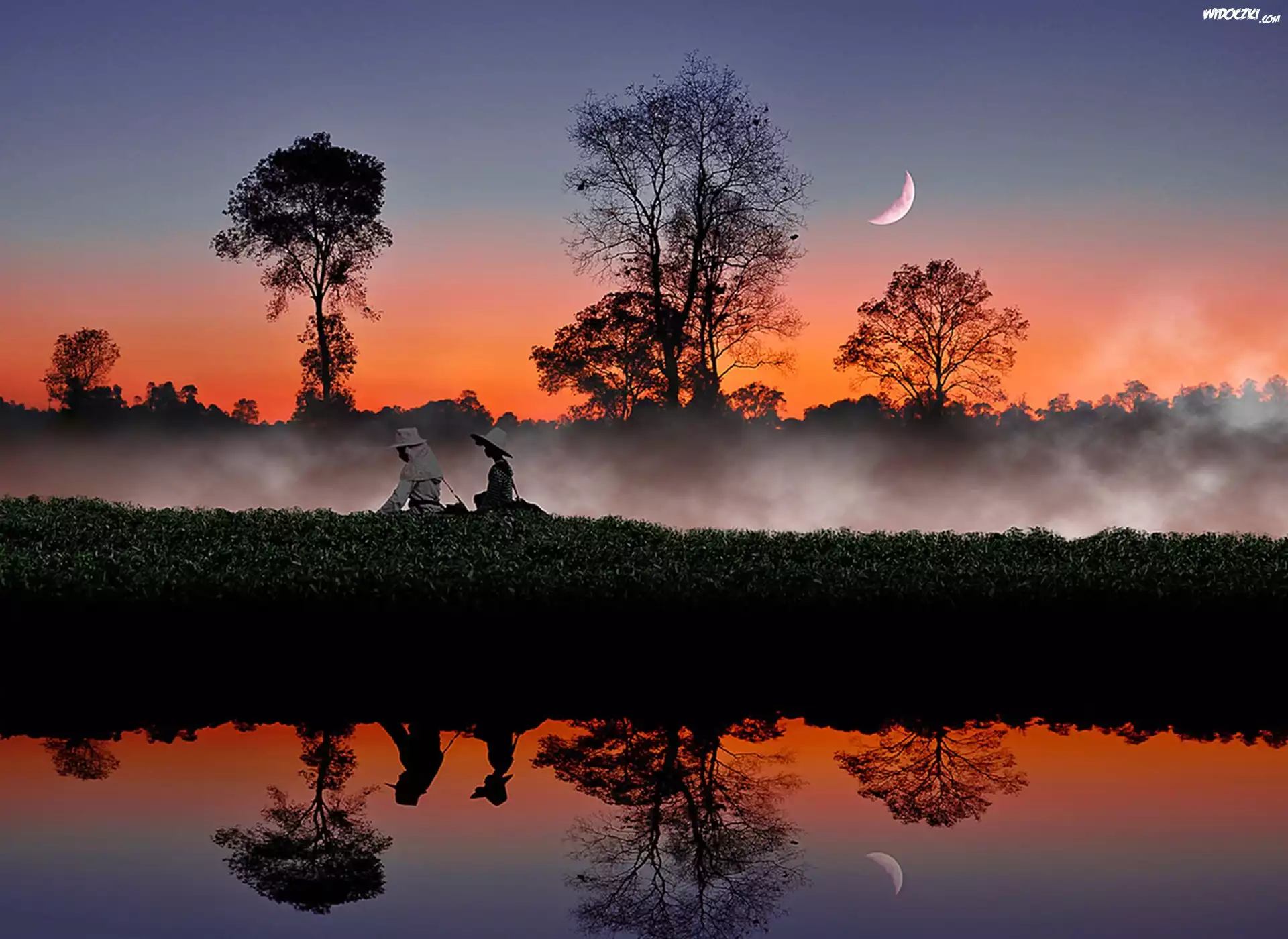 Zachód, Słońca, Mgła, Drzewa, Odbicie