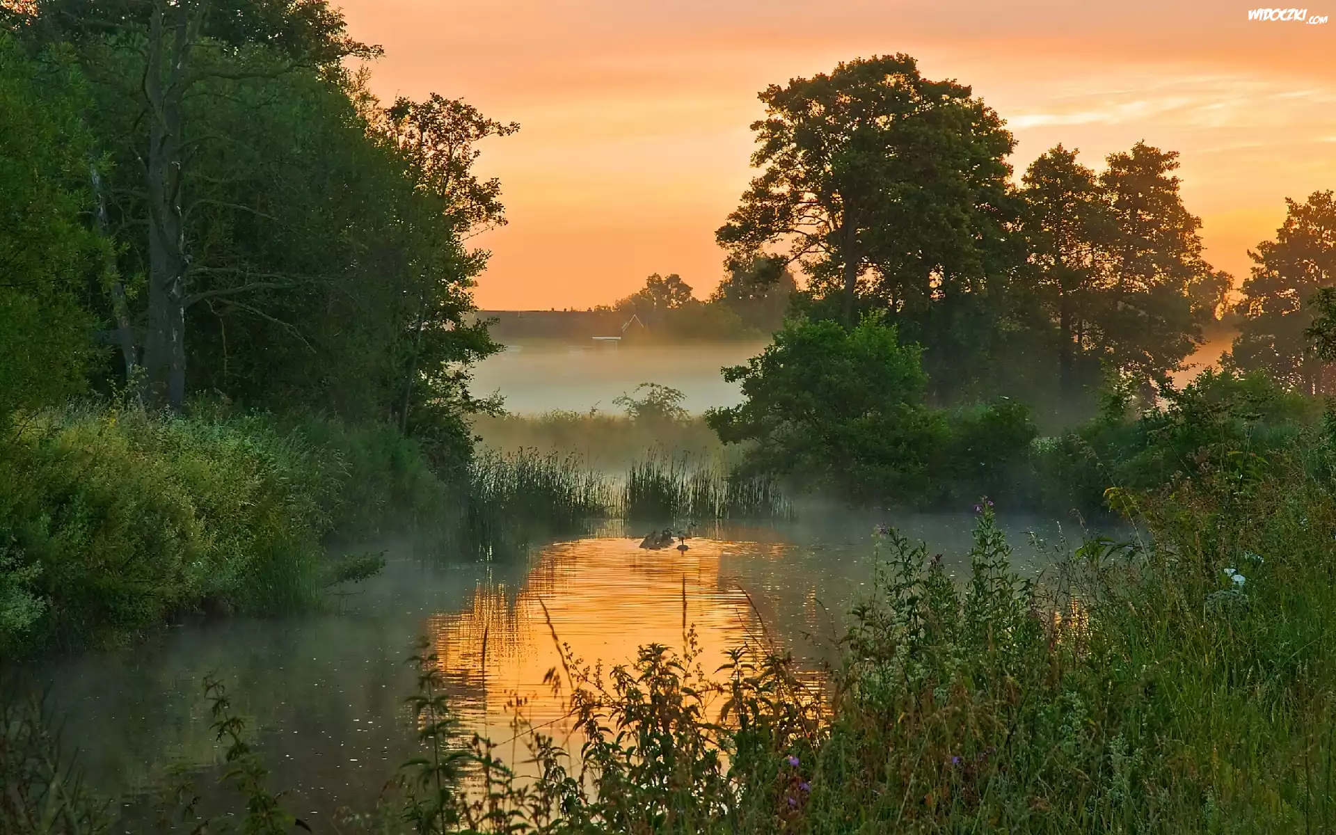 Zachód, Słońca, Mgła, Drzewa, Staw