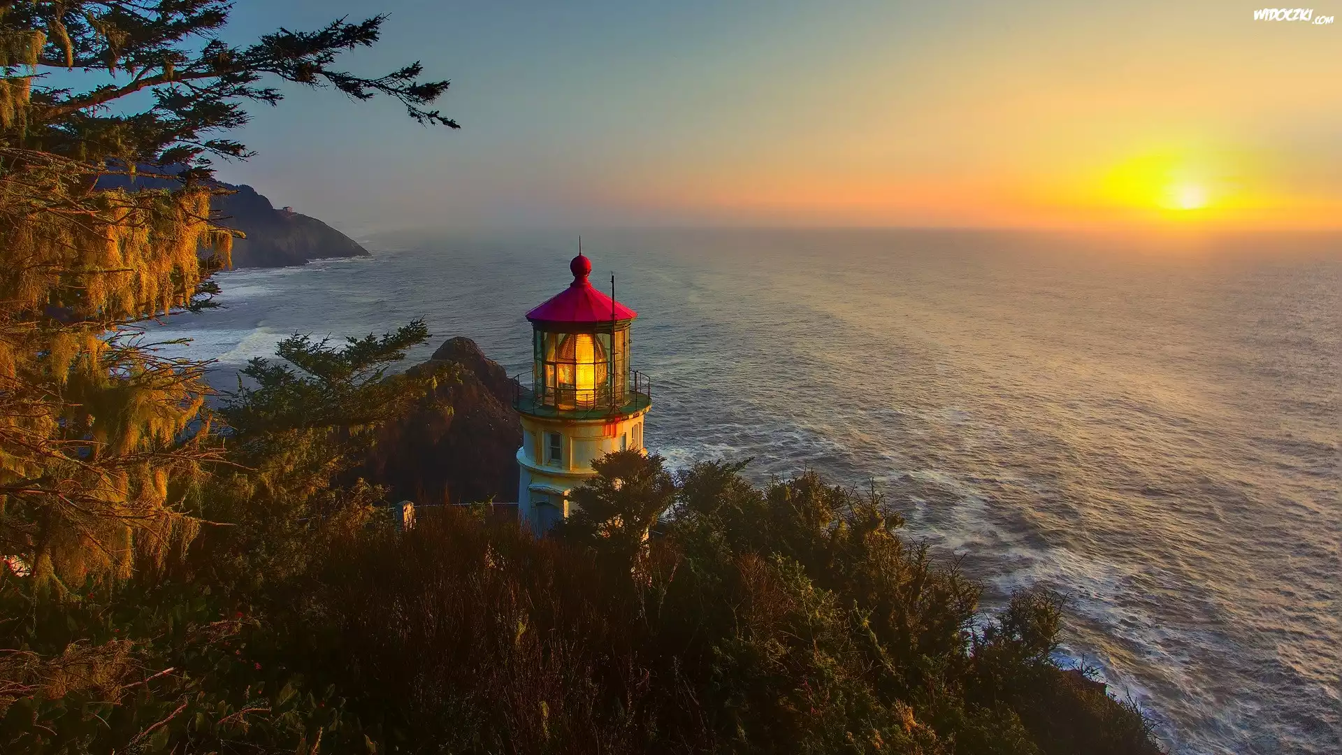 Zdjęcia, Zachód, Słońca, Morze, Brzeg, Drzewa, Latarnia