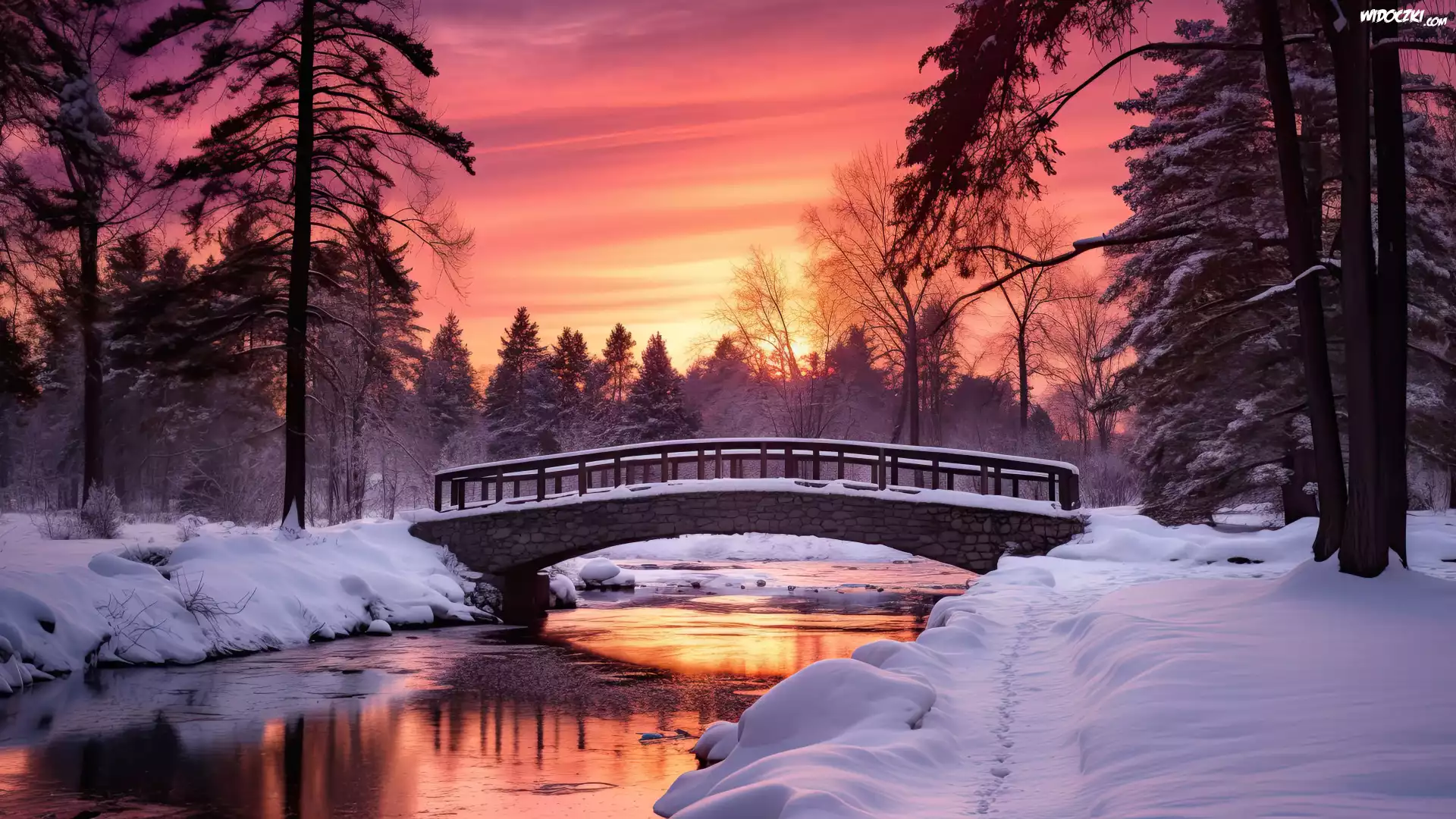 Zima, Rzeka, Most, Zachód słońca, Drzewa
