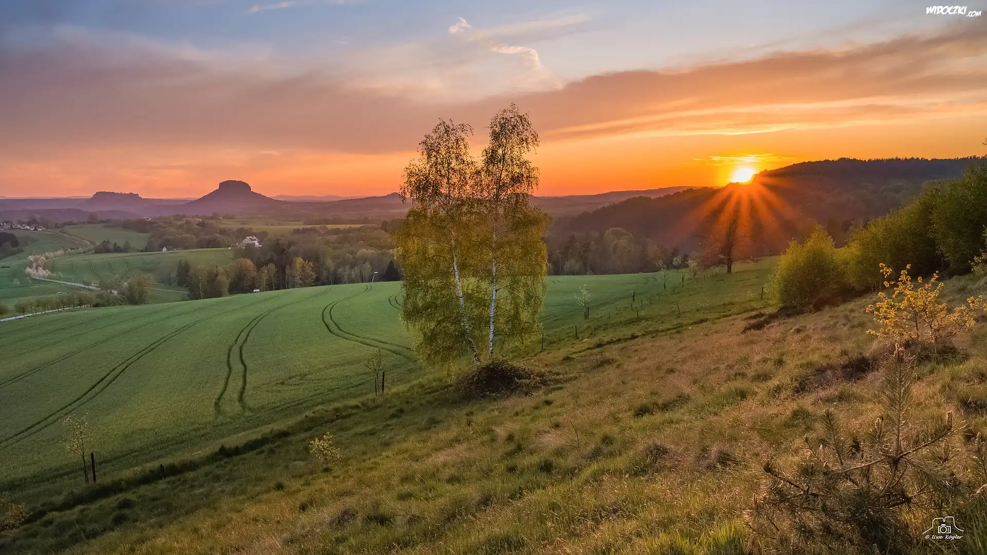 Zdjęcia, Zachód słońca, Góra Lilienstein, Łąka, Pola, Drzewa, Saksonia, Niemcy