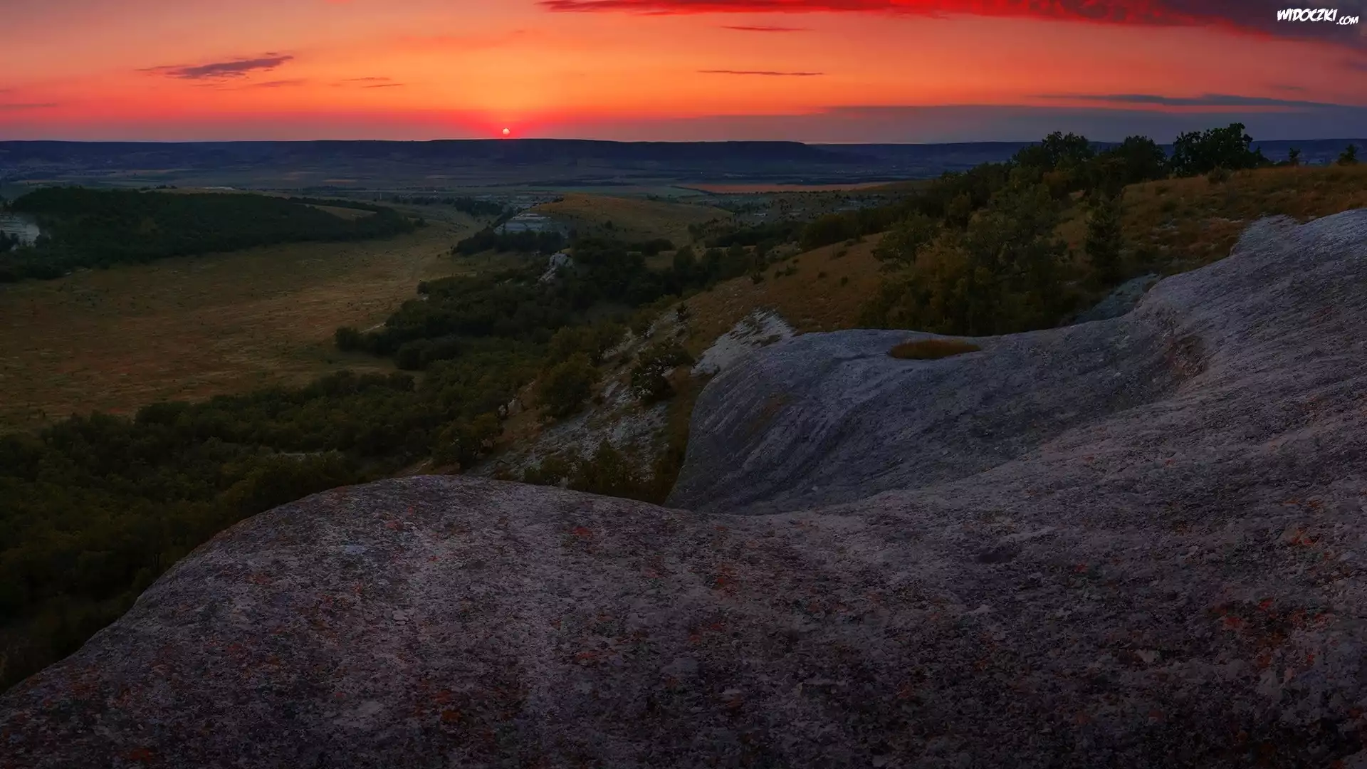 Zdjęcia, Zachód słońca, Skały, Drzewa, Wyżyny
