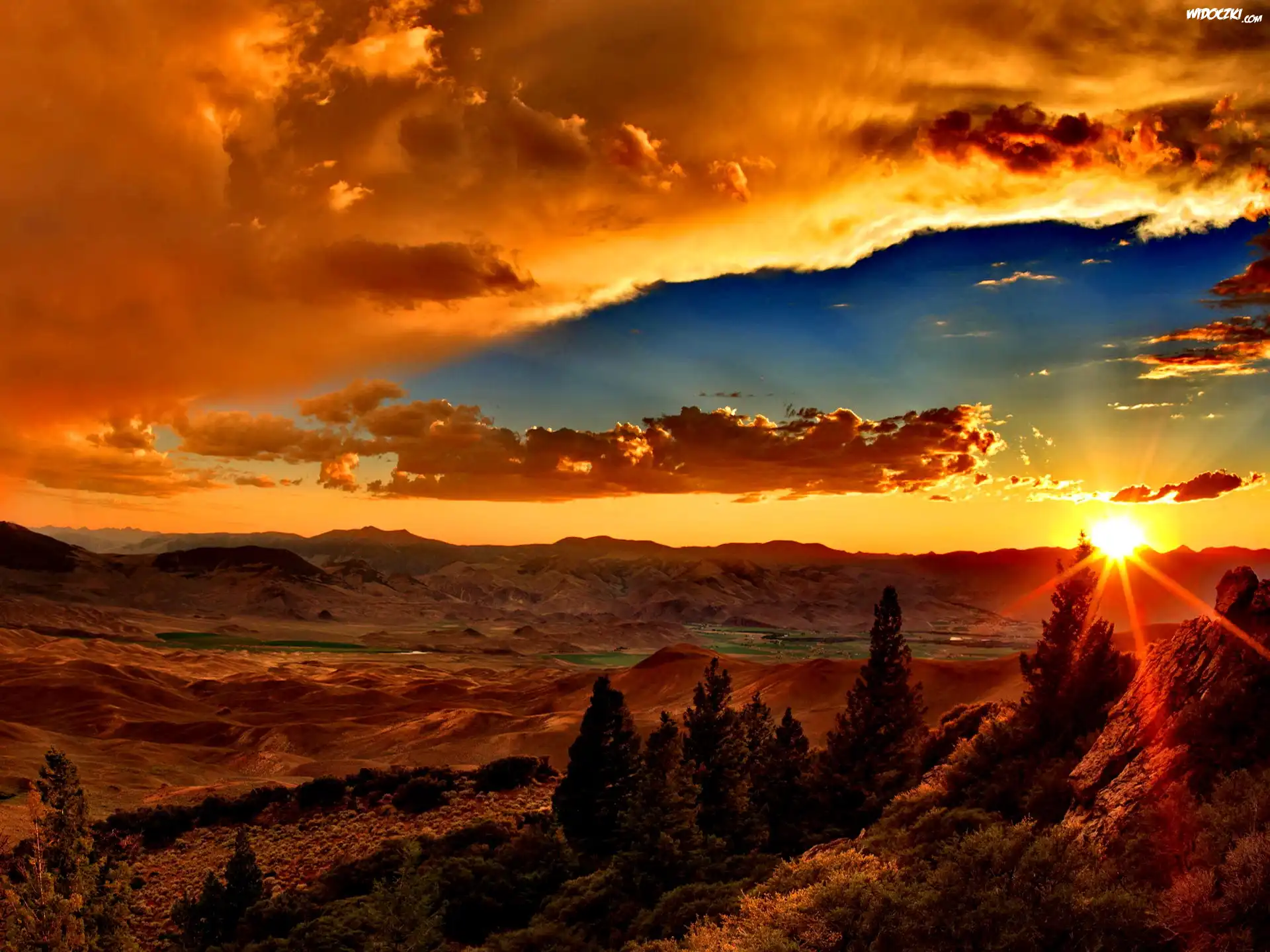 Zdjęcia, Zachód, Słońca, Drzewa, Góry