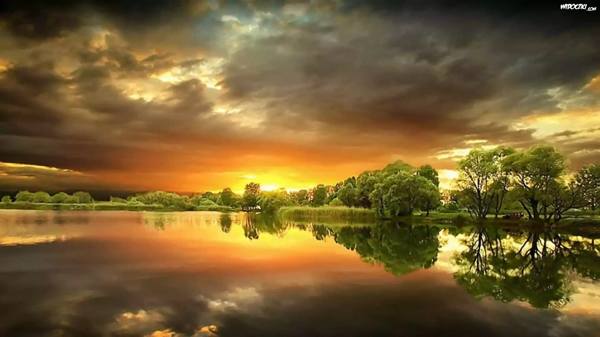 Zdjęcia, Zachód, Słońca, Drzewa, Jezioro