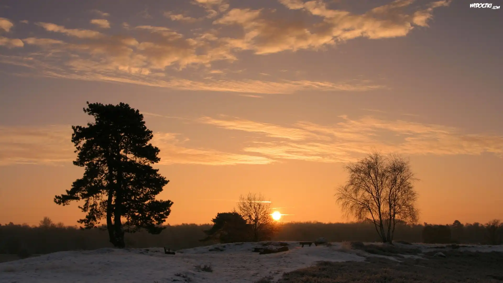 Zdjęcia, Zachód, Słońca, Drzewa, Śnieg