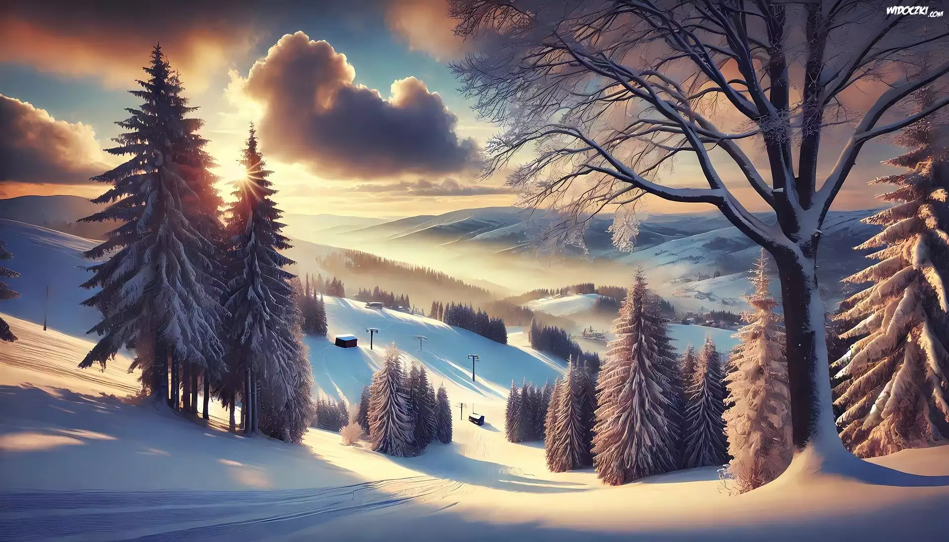 Zima, Zbocze, Drzewa, Zachód słońca, Grafika, Góry