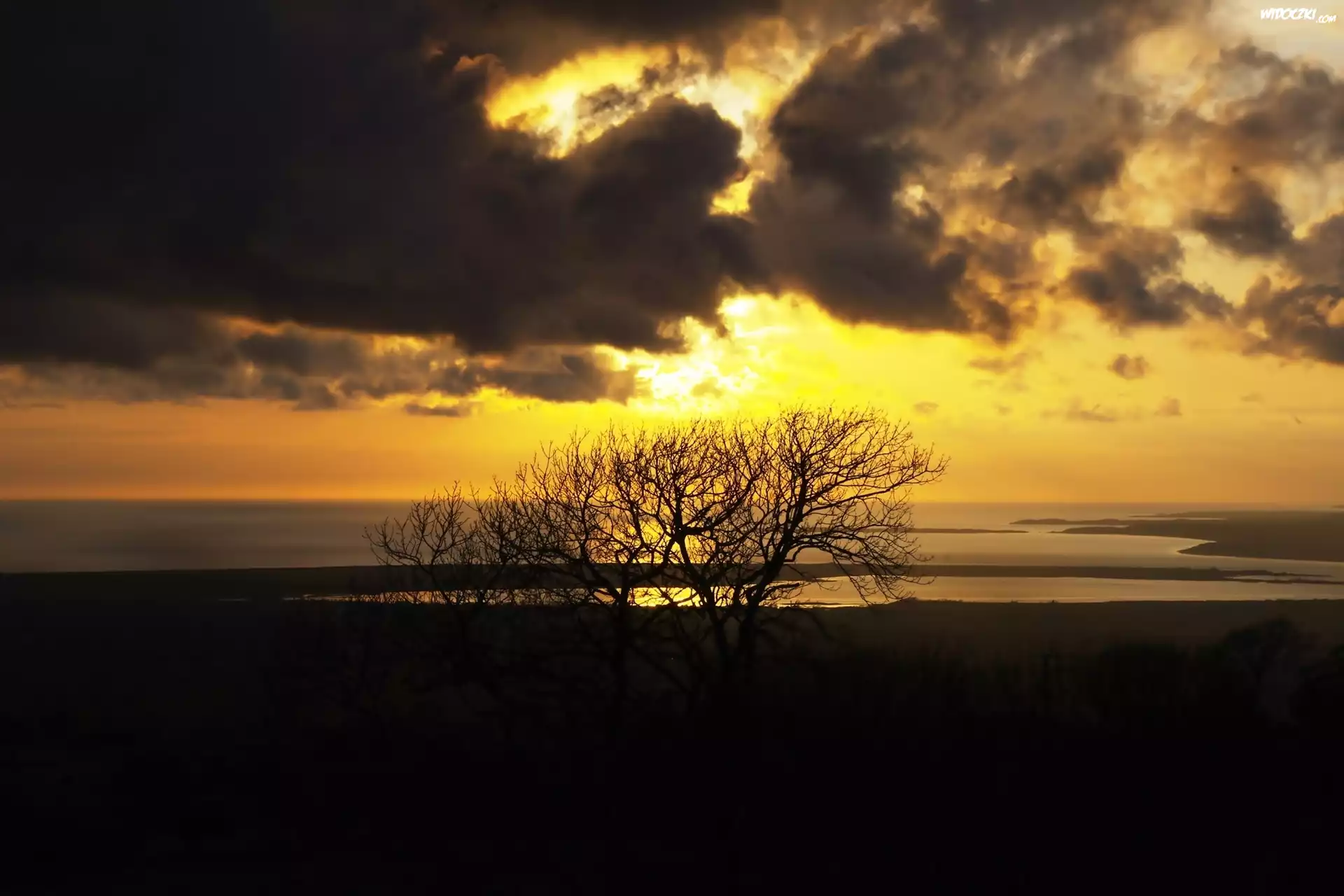 Zdjęcia, Zachód Słońca, Chmury, Drzewo, Jezioro