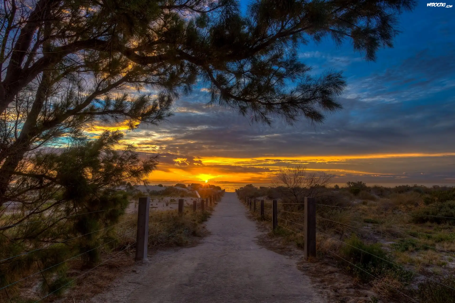 Zdjęcia, Zachód, Słońca, Ścieżka, Drzewo, Morze