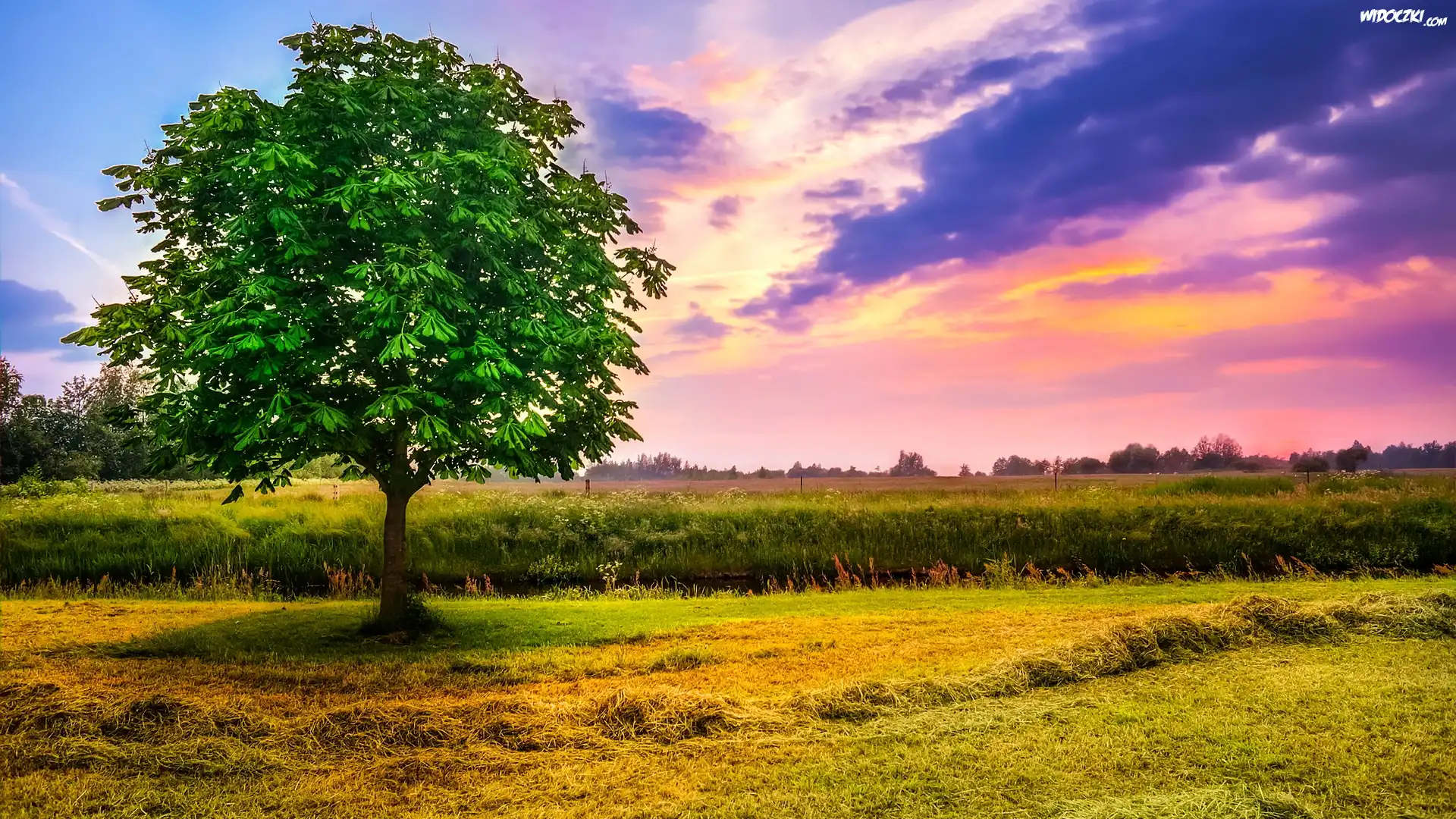 Zdjęcia, Łąka, Drzewo, Kasztanowiec, Zachód słońca
