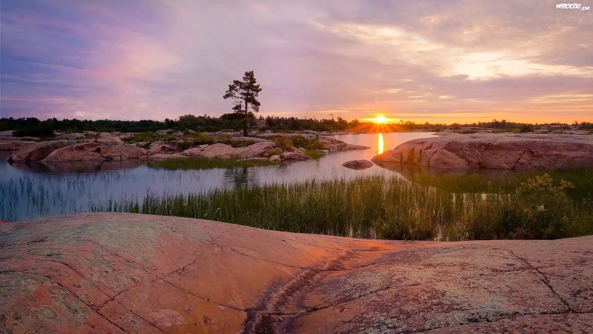 Zdjęcia, Zachód, Słońca, Rzeka, Drzewo, Skały