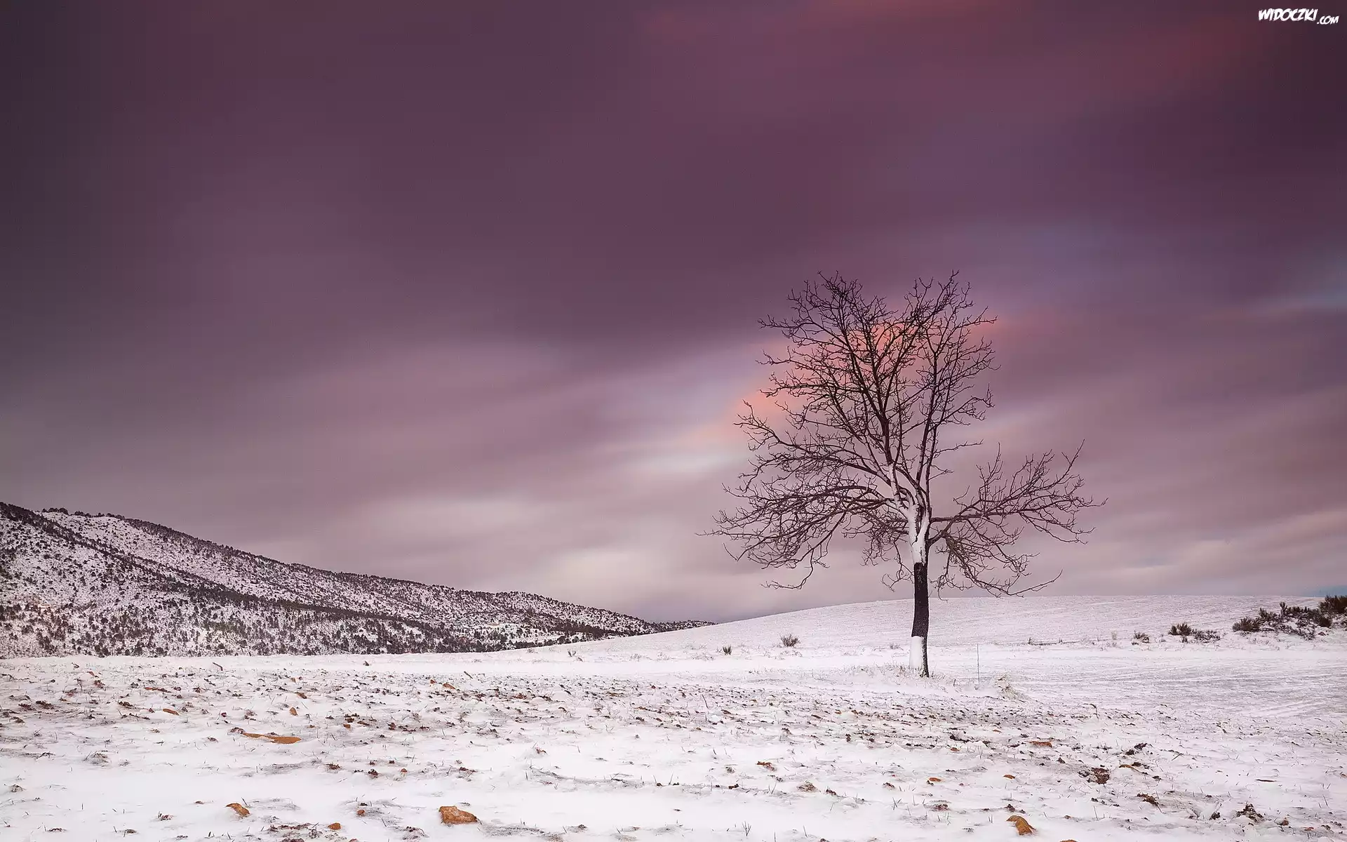 Zdjęcia, Zachód, Słońca, Samotne, Drzewo, Zima