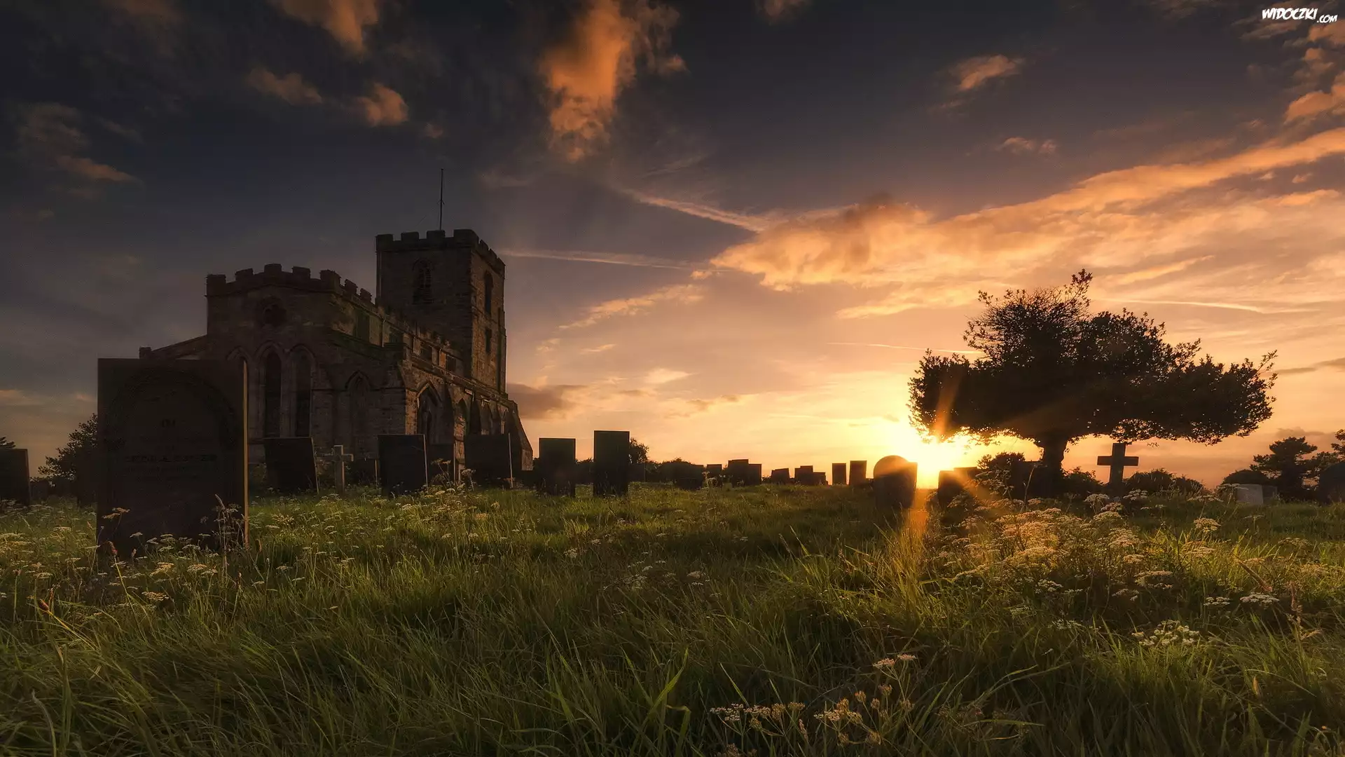 Zachód słońca, Drzewo, Cmentarz